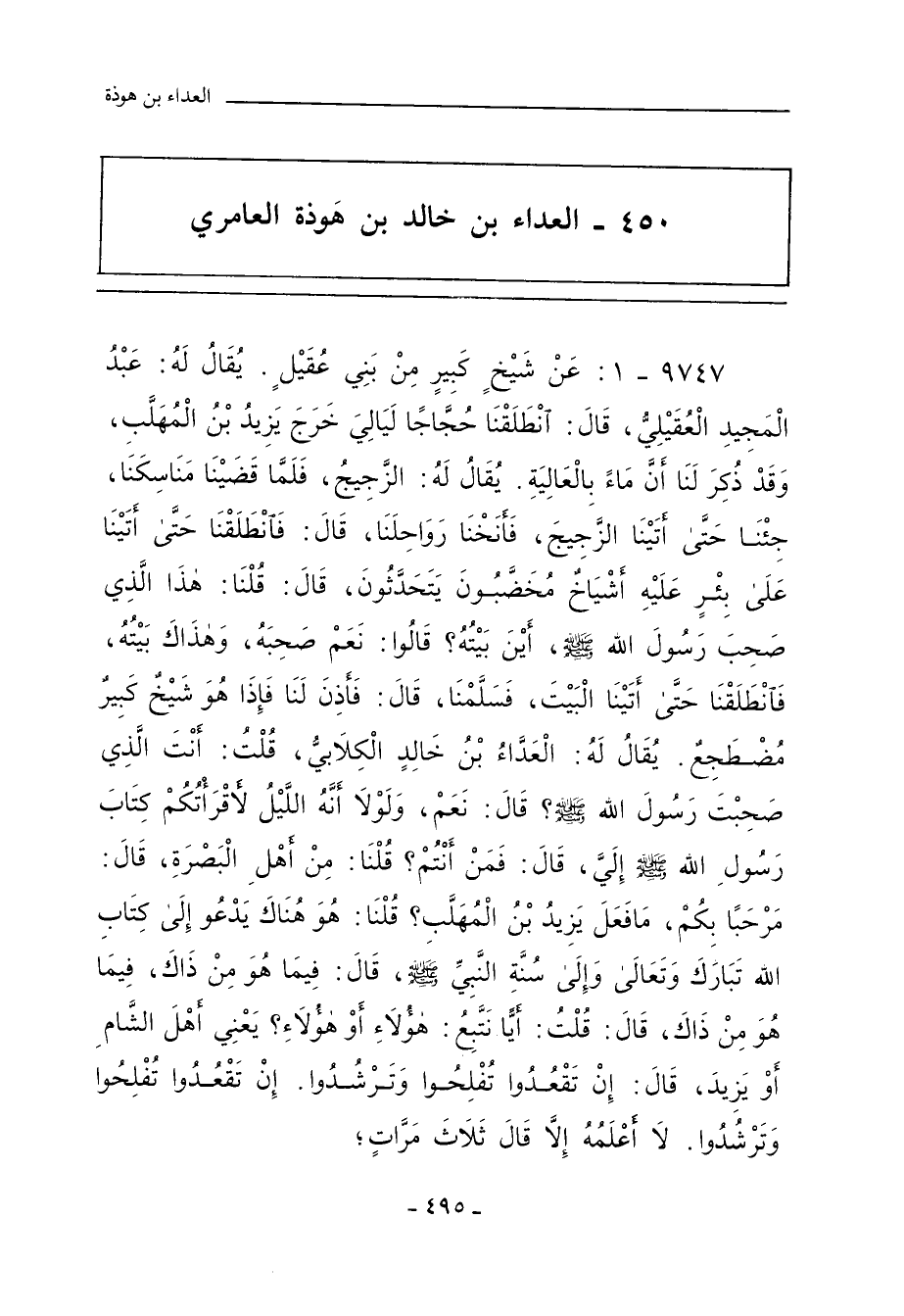 ٩٧٤٧ - عَنْ شَيْخٍ كَبِيرٍ، مِنْ بَنِي عُقَيْلٍ، يُقَالُ لَهُ: عَبْدُ الْمَجِيدِ الْعُقَيْلِيُّ، قَالَ: انْطَلَقْنَا حُجَّاجًا، لَيَالِيَ خَرَجَ يَزِيدُ بْنُ الْمُهَلَّبِ، وَقَدْ ذُكِرَ لَنَا أَنَّ مَاءً بِالْعَالِيَةِ، يُقَالُ لَهُ: الزُّجَيْحُ، فَلَمَّا قَضَيْنَا مَنَاسِكَنَا، جِئْنَا حَتَّى أَتَيْنَا الزُّجَيْحَ، فَأَنَخْنَا رَوَاحِلَنَا، قَالَ: فَانْطَلَقْنَا حَتَّى أَتَيْنَا عَلَى بِئْرٍ، عَلَيْهِ أَشْيَاخٌ مُخَضَّبُونَ يَتَحَدَّثُونَ، قَالَ: قُلْنَا: هَذَا الَّذِي صَحِبَ رَسُولَ اللهِ صلى الله عليه وسلم، أَيْنَ بَيْتُهُ؟ قَالُوا: نَعَمْ صَحِبَهُ، وَهَذَاكَ بَيْتُهُ، فَانْطَلَقْنا حَتَّى أَتَيْنَا الْبَيْتَ، فَسَلَّمْنَا، قَالَ: فَأَذِنَ لَنَا، فَإِذَا هُوَ شَيْخٌ كَبِيرٌ مُضْطَجِعٌ، يُقَالُ لَهُ: الْعَدَّاءُ بْنُ خَالِدٍ الْكِلَابِيُّ، قُلْنَا: أَنْتَ الَّذِي صَحِبْتَ رَسُولَ اللهِ صلى الله عليه وسلم؟ قَالَ: نَعَمْ، وَلَوْلَا أَنَّهُ اللَّيْلُ لأَقْرَأْتُكُمْ كِتَابَ رَسُولِ اللهِ صلى الله عليه وسلم إِلَيَّ، قَالَ: فَمَنْ أَنْتُمْ؟ قُلْنَا: مِنْ أَهْلِ الْبَصْرَةِ، قَالَ: مَرْحَبًا بِكُمْ، مَا فَعَلَ يَزِيدُ بْنُ الْمُهَلَّبِ؟ قُلْنَا: هُوَ هُنَاكَ يَدْعُو إِلَى كِتَابِ اللهِ، تَبَارَكَ وَتَعَالَى، وَإِلَى سُنَّةِ النَّبِيِّ صلى الله عليه وسلم، قَالَ: فِيمَا هُوَ مِنْ ذَاكَ، فِيمَا هُوَ مِنْ ذَاكَ؟ قُلْتُ: أَيًّا نَتَّبِعُ: هَؤُلَاءِ، أَوْ هَؤُلَاءِ؟ يَعْنِي أَهْلَ الشَّامِ، أَوْ يَزِيدَ، قَالَ: إِنْ تَقْعُدُوا تُفْلِحُوا وَتَرْشُدُوا، إِنْ تَقْعُدُوا تُفْلِحُوا وَتَرْشُدُوا، لَا أَعْلَمُهُ إِلَاّ قَالَ ثَلَاثَ مَرَّاتٍ: