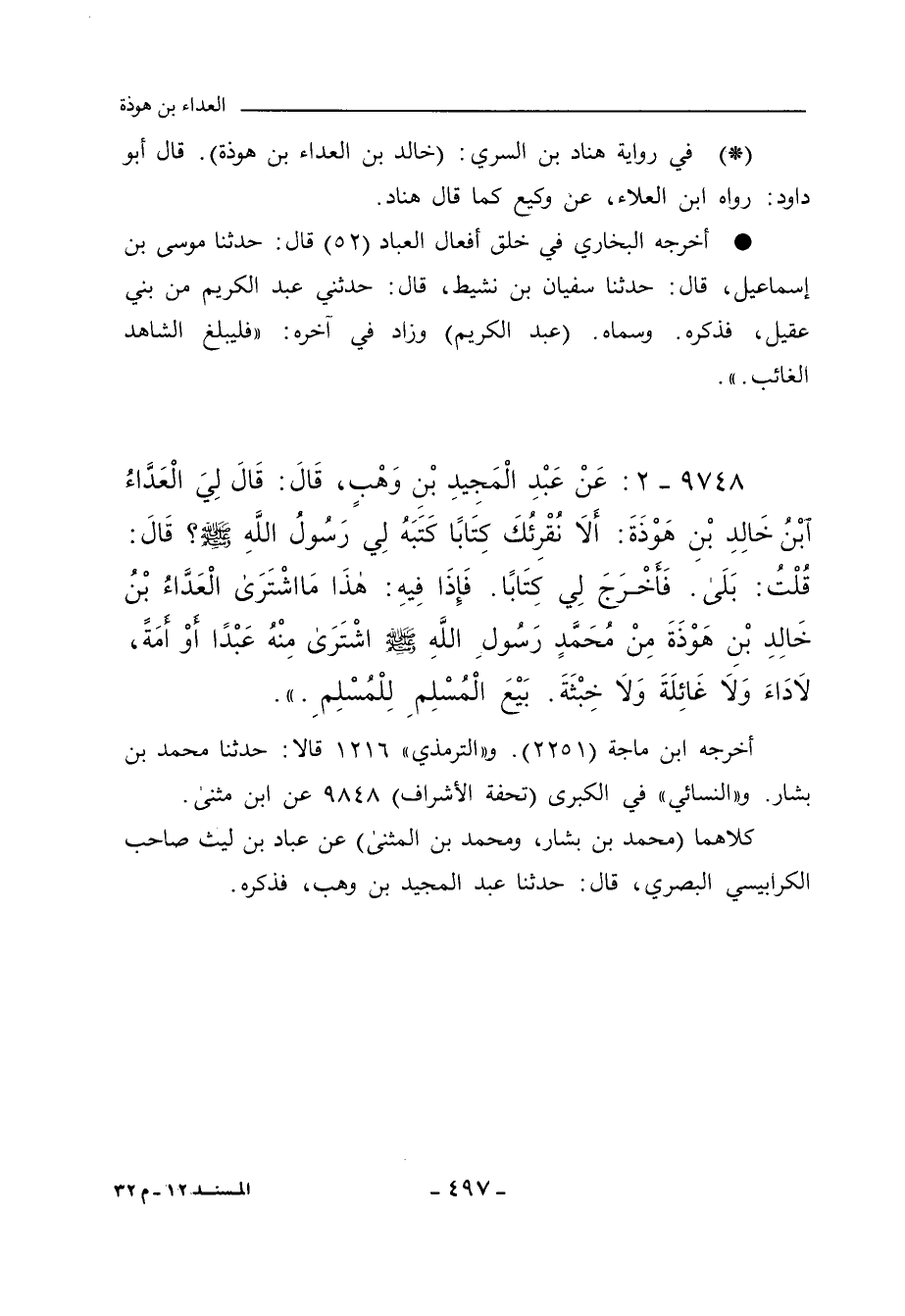 ٩٧٤٨ - عَنْ عَبْدِ الْمَجِيدِ بْنِ وَهْبِ، قَالَ: قَالَ لِيَ الْعَدَّاءُ بْنُ خَالِدِ بْنِ هَوْذَةَ: أَلَا نُقْرِئُكَ كِتَابًا كَتَبَهُ لِيَ رَسُولُ اللهِ صلى الله عليه وسلم؟ قَالَ: قُلْتُ: بَلَى، فَأَخْرَجَ لِي كِتَابًا، فَإِذَا فِيهِ: