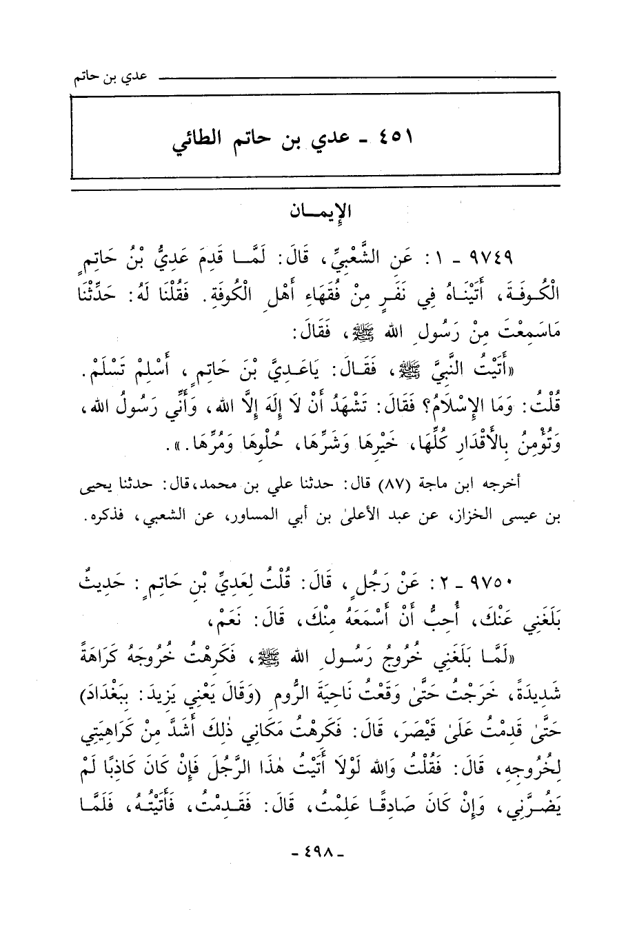 أَتَيْتُ النَّبِيَّ صلى الله عليه وسلم , فَقَالَ: يَا عَدِيَّ بْنَ حَاتِمٍ، أَسْلِمْ تَسْلَمْ، قُلْتُ: وَمَا الإِسْلَامُ؟ فَقَالَ: تَشْهَدُ أَنْ لَا إِلَهَ إِلَاّ اللَّهُ، وَأَنِّي رَسُولُ اللهِ، وَتُؤْمِنُ بِالأَقْدَارِ كُلِّهَا، خَيْرِهَا وَشَرِّهَا، حُلْوِهَا وَمُرِّهَا.