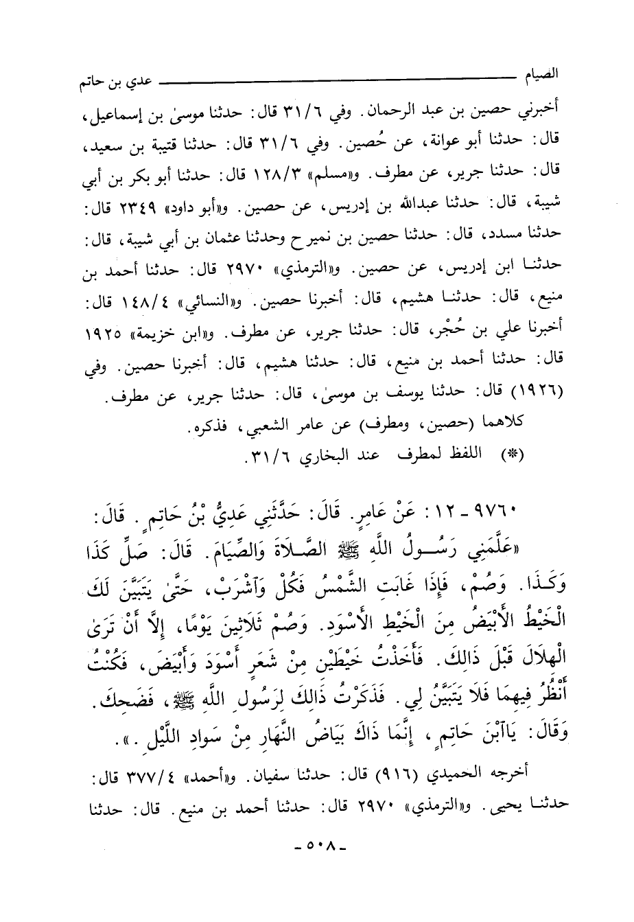 عَلَّمَنِي رَسُولُ اللهِ صلى الله عليه وسلم الصَّلَاةَ وَالصِّيَامَ، قَالَ: صَلِّ كَذَا وَكَذَا، وَصُمْ، فَإِذَا غَابَتِ الشَّمْسُ، فَكُلْ وَاشْرَبْ، حَتَّى يَتَبَيَّنَ لَكَ الْخَيْطُ الأَبْيَضُ مِنَ الْخَيْطِ الأَسْوَدِ، وَصُمْ ثَلَاثِينَ يَوْمًا، إِلَاّ أَنْ تَرَى الْهِلَالَ قَبْلَ ذَلِكَ، فَأَخَذْتُ خَيْطَيْنِ مِنْ شَعَرٍ أَسْوَدَ وَأَبْيَضَ، فَكُنْتُ أَنْظُرُ فِيهِمَا، فَلَا يَتَبَيَّنُ لِي، فَذَكَرْتُ ذَلِكَ لِرَسُولِ اللهِ صلى الله عليه وسلم، فَضَحِكَ، وَقَالَ: يَا ابْنَ حَاتِمٍ، إِنَّمَا ذَاكَ بَيَاضُ النَّهَارِ مِنْ سَوَادِ اللَّيْلِ.
