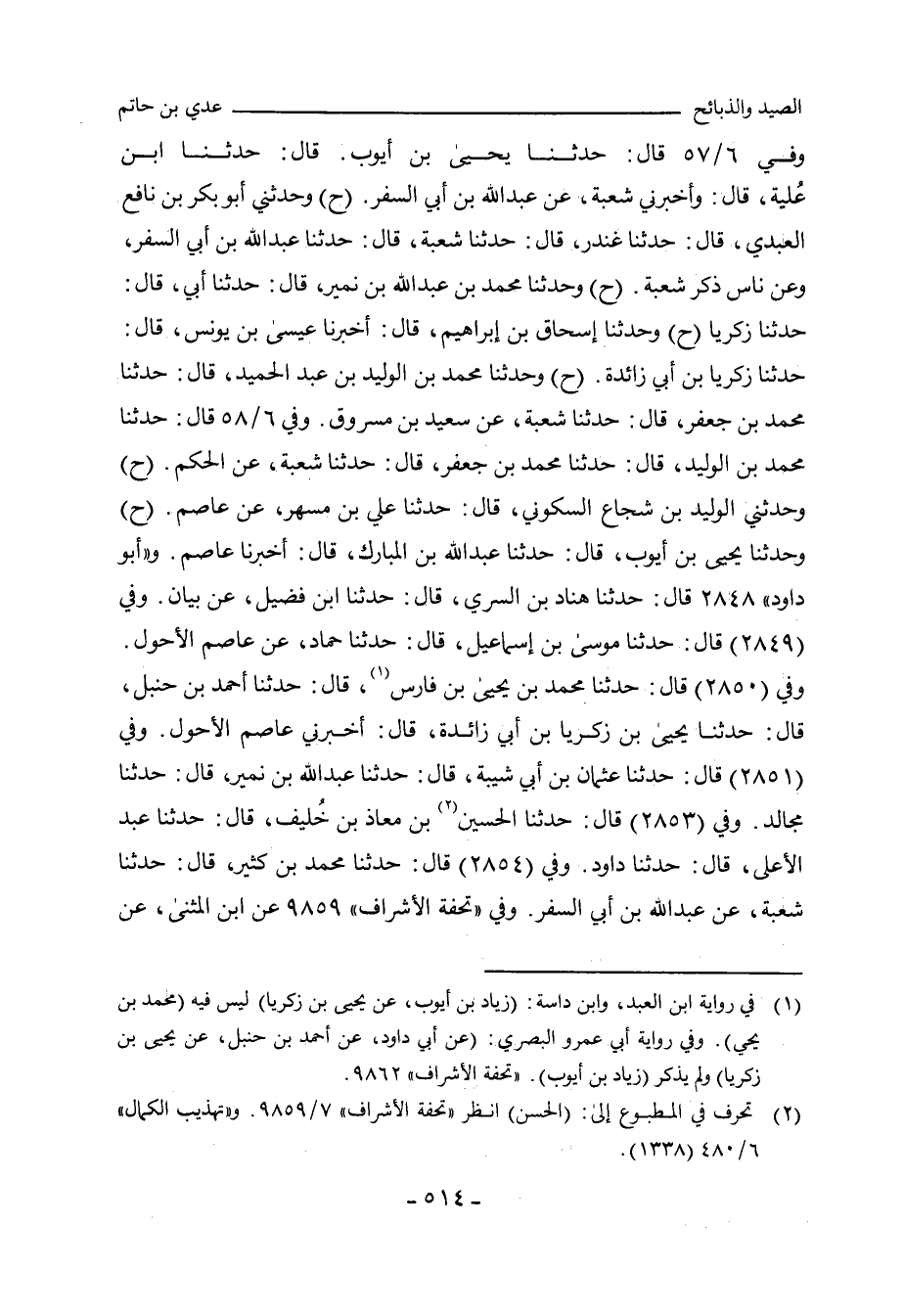 وفي ٦/ ٥٧ (٥٠١٤) قال: وحدَّثنا يَحيى بن أَيُّوب، حدَّثنا ابن عُلَيَّة، قال: وأخبرني شُعْبة، عن عَبْد الله بن أَبي السَّفَر. وفي (٥٠١٥) قال: وحدَّثني أبو بَكْر بن نافع العَبْدِي، حدَّثنا غُنْدَر، حدَّثنا شُعْبة، حدَّثنا عَبْد الله بن أَبي السَّفَر، وعن ناس ذكر شُعْبة. وفي (٥٠١٦) قال: وحدَّثنا مُحَمد بن عَبْد الله بن نُمَيْر، حدَّثنا أَبي، حدَّثنا زكريا. وفي (٥٠١٧) قال: وحدَّثنا إِسْحاق بن إبراهيم، أَخْبَرنا عِيسَى بن يُونُس، حدَّثنا زكريا بن أَبي زائدة. وفي (٥٠١٨) قال: وحدَّثنا مُحَمد بن الوَلِيد بن عَبْد الحَمِيد، حدَّثنا مُحَمد بن جَعْفَر، حدَّثنا شُعْبة، عن سَعِيد بن مَسْرُوق. وفي ٦/ ٥٨ (٥٠١٩) قال: وحدَّثنا مُحَمد بن الوَلِيد، حدَّثنا مُحَمد بن جَعْفَر، حدَّثنا شُعْبة، عن الحَكَم. وفي (٥٠٢٠) قال: حدَّثني الوَلِيد بن شُجَاع السَّكُونِي، حدَّثنا علي بن مُسْهِر، عن عاصم. وفي (٥٠٢١) قال: حدَّثنا يَحيى بن
