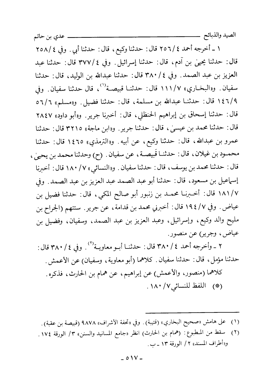 ١ - أخرجه أحمد ٤/ ٢٥٦ (١٨٤٣٨) قال: حدَّثنا وَكِيع، حدَّثنا أَبي. وفي ٤/ ٢٥٨ (١٨٤٥٥) قال: حدَّثنا يَحيى بن آدم، حدَّثنا إِسْرائِيل. وفي ٤/ ٣٧٧ (١٩٥٨٩) قال: حدَّثنا عَبْد العَزِيز بن عَبْد الصَّمد. وفي ٤/ ٣٨٠ (١٩٦١٣) قال: حدَّثنا عَبْد الله بن الوَلِيد، حدَّثنا سُفْيان. و"البُخَارِي" ٧/ ١١١ (٥٤٧٧) قال: حدَّثنا قَبِيصَة , حدَّثنا سُفْيان. وفي ٩/ ١٤٦ (٧٣٩٧) قال: حدَّثنا عَبْد الله بن مَسْلَمَة، حدَّثنا فُضَيْل. و"مسلم"٦/ ٥٦ (٥٠١١) قال: حدَّثنا إِسْحاق بن إبراهيم الحَنْظَلِي، أَخْبَرنا جَرِير. و"أبو داود"٢٨٤٧ قال: حدَّثنا مُحَمد بن عِيسَى، حدَّثنا جَرِير. و"ابن ماجة" ٣٢١٥ قال: حدَّثنا عَمْرو بن عَبْد الله، حدَّثنا وَكِيع، عن أبيه. و"التِّرمِذي" ١٤٦٥ قال: حدَّثنا محمود بن غَيْلَان، حدَّثنا قَبِيصَة، عن سُفْيان (ح) وحدَّثنا مُحَمد بن يَحيى، حدَّثنا مُحَمد بن يُوسُف، حدَّثنا سُفْيان. و"النَّسائي"٧/ ١٨٠، وفي "الكبرى" ٤٧٥٨ قال: أَخْبَرنا إِسْماعِيل بن مَسْعُود، قال: حدَّثنا أبو عَبْد الصَّمد، عَبْد العَزِيز بن عَبْد الصَّمد. وفي ٧/ ١٨١، وفي "الكبرى"٤٧٦٠ قال: أَخْبَرنا مُحَمد بن زُنْبُور، أبو صالح المَكِّي، قال: حدَّثنا فُضَيْل بن عِيَاض. وفي ٧/ ١٩٤، وفي "الكبرى"٤٧٩٨ قال: أخبرني مُحَمد بن قُدَامَة، عن جَرِير.