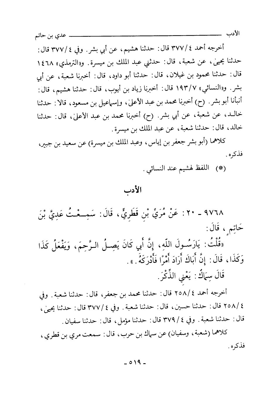 ٩٧٦٨ - عَنْ مُرَيِّ بْنِ قَطَرِيٍّ، قَالَ: سَمِعْتُ عَدِيَّ بْنَ حَاتِمٍ، قَالَ: