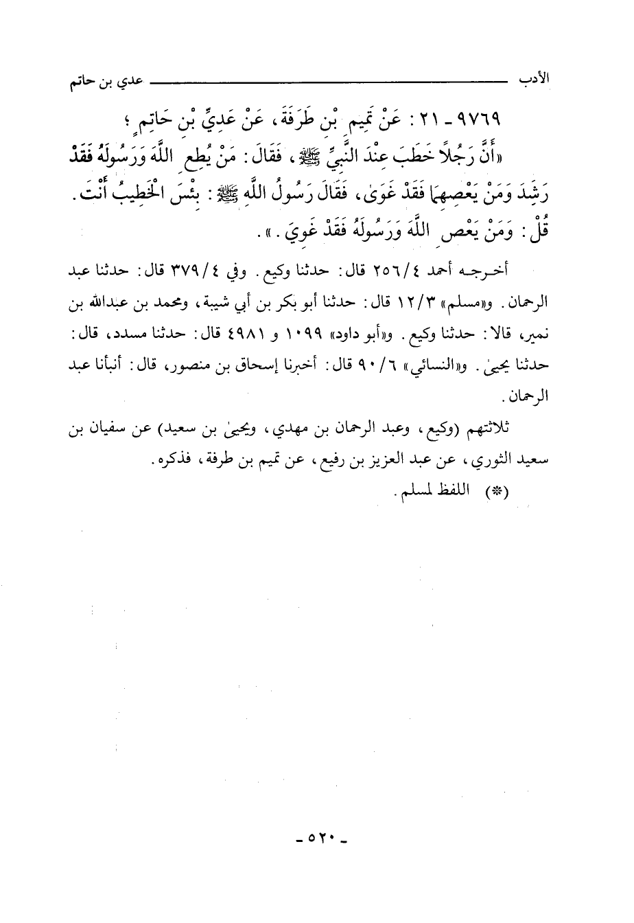 أَنَّ رَجُلاً خَطَبَ عِنْدَ النَّبِيِّ صلى الله عليه وسلم، فَقَالَ: مَنْ يُطِعِ اللهَ وَرَسُولَهُ فَقَدْ رَشَِدَ، وَمَنْ يَعْصِهِمَا فَقَدْ غَوَى، فَقَالَ رَسُولُ اللهِ صلى الله عليه وسلم: بِئْسَ الْخَطِيبُ أَنْتَ، قُلْ: وَمَنْ يَعْصِ اللهَ وَرَسُولَهُ - قَالَ ابْنُ نُمَيْرٍ: فَقَدْ غَوِيَ -.