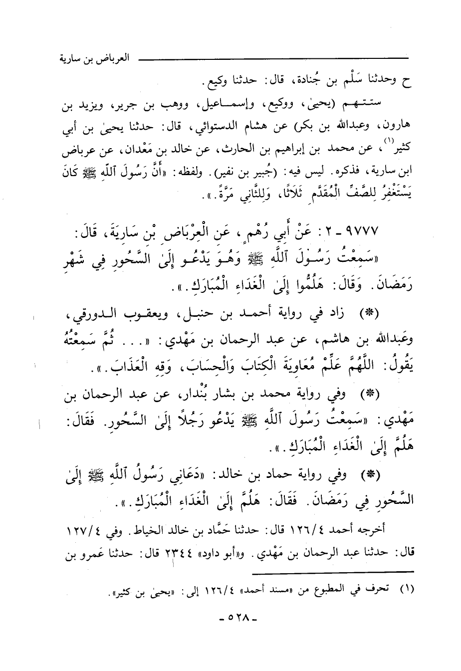 ستتهم (يحيى، ووكيع، وإسماعيل، ووهب، وزيد بن هارون، وعبد الله بن بكر) عن يَحيى بن أَبي كَثِير , عن مُحَمد بن إبراهيم بن الحارث، عن خالد بن مَعْدان، عَنِ الْعِرْبَاضِ بْنِ سَارِيَةَ، أَنَّهُ حَدَّثَهُمْ؛
