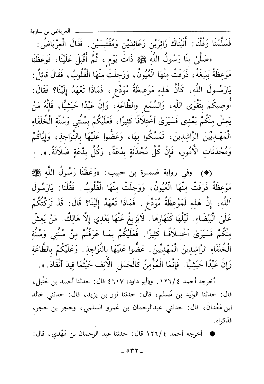 صَلَّى بِنَا رَسُولُ اللهِ صلى الله عليه وسلم ذَاتَ يَوْمٍ، ثُمَّ أَقْبَلَ عَلَيْنَا، فَوَعَظَنَا مَوْعِظَةً بَلِيغَةً، ذَرَفَتْ مِنْهَا الْعُيُونُ، وَوَجِلَتْ مِنْهَا الْقُلُوبُ، فَقَالَ قَائِلٌ: يَا رَسُولَ اللهِ، كَأَنَّ هَذِهِ مَوْعِظَةُ مُوَدِّعٍ، فَمَاذَا تَعْهَدُ إِلَيْنَا؟ فَقَالَ: أُوصِيكُمْ بِتَقْوَى اللهِ، وَالسَّمْعِ وَالطَّاعَةِ، وَإِنْ عَبْدًا حَبَشِيًّا، فَإِنَّهُ مَنْ يَعِشْ مِنْكُمْ بَعْدِي، فَسَيَرَى اخْتِلَافًا كَثِيرًا، فَعَلَيْكُمْ بِسُنَّتِي، وَسُنَّةِ الْخُلَفَاءِ الْمَهْدِيِّينَ الرَّاشِدِينَ، تَمَسَّكُوا بِهَا، وَعَضُّوا عَلَيْهَا بِالنَّوَاجِذِ، وَإِيَّاكُمْ وَمُحْدَثَاتِ الأُمُورِ، فَإِنَّ كُلَّ مُحْدَثَةٍ بِدْعَةٌ، وَكُلَّ بِدْعَةٍ ضَلَالَةٌ.