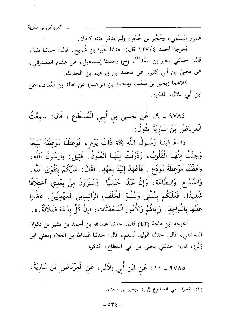 ٩٧٨٤ - عَنْ يَحْيَى بْنِ أَبِي الْمُطَاعِ، قَالَ: سَمِعْتُ الْعِرْبَاضَ بْنَ سَارِيَةَ يَقُولُ: