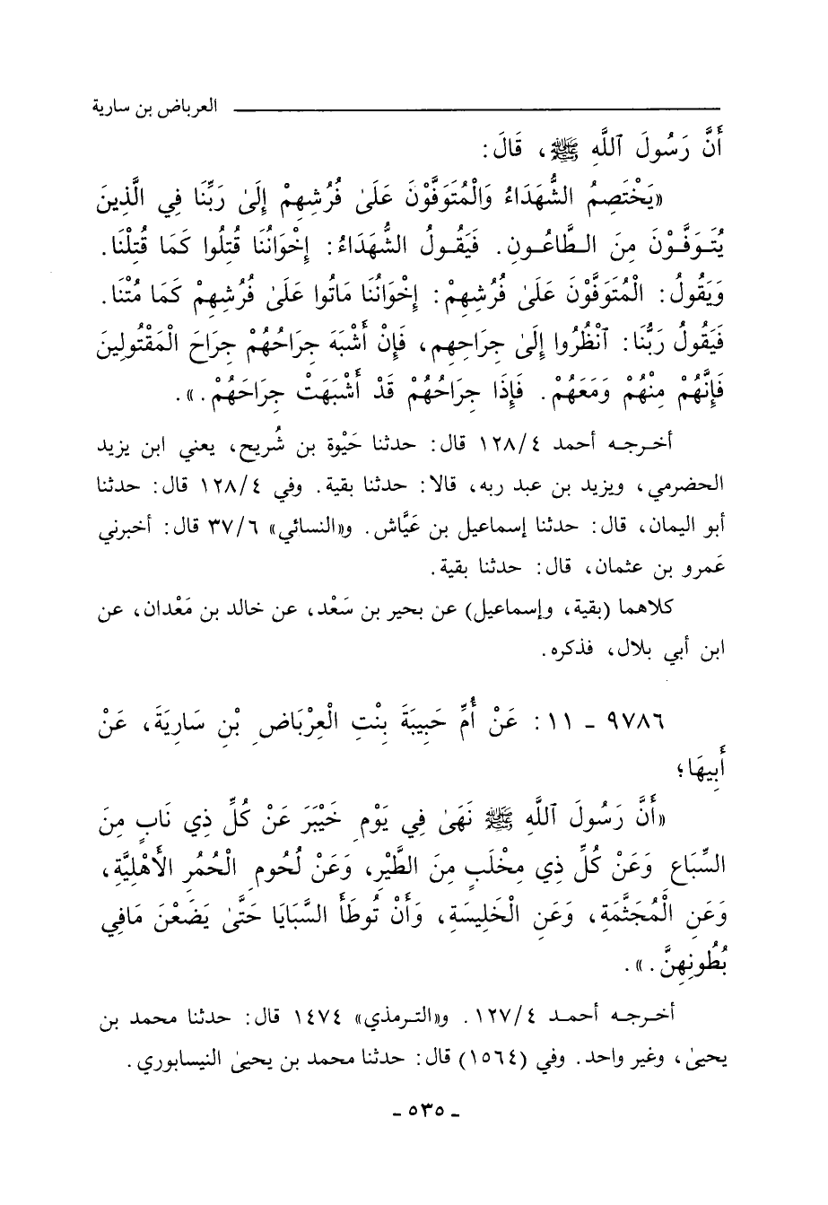 ٩٧٨٦ - عَنْ أُمِّ حَبِيبَةَ بِنْتِ الْعِرْبَاضِ، عَنْ أَبِيهَا؛