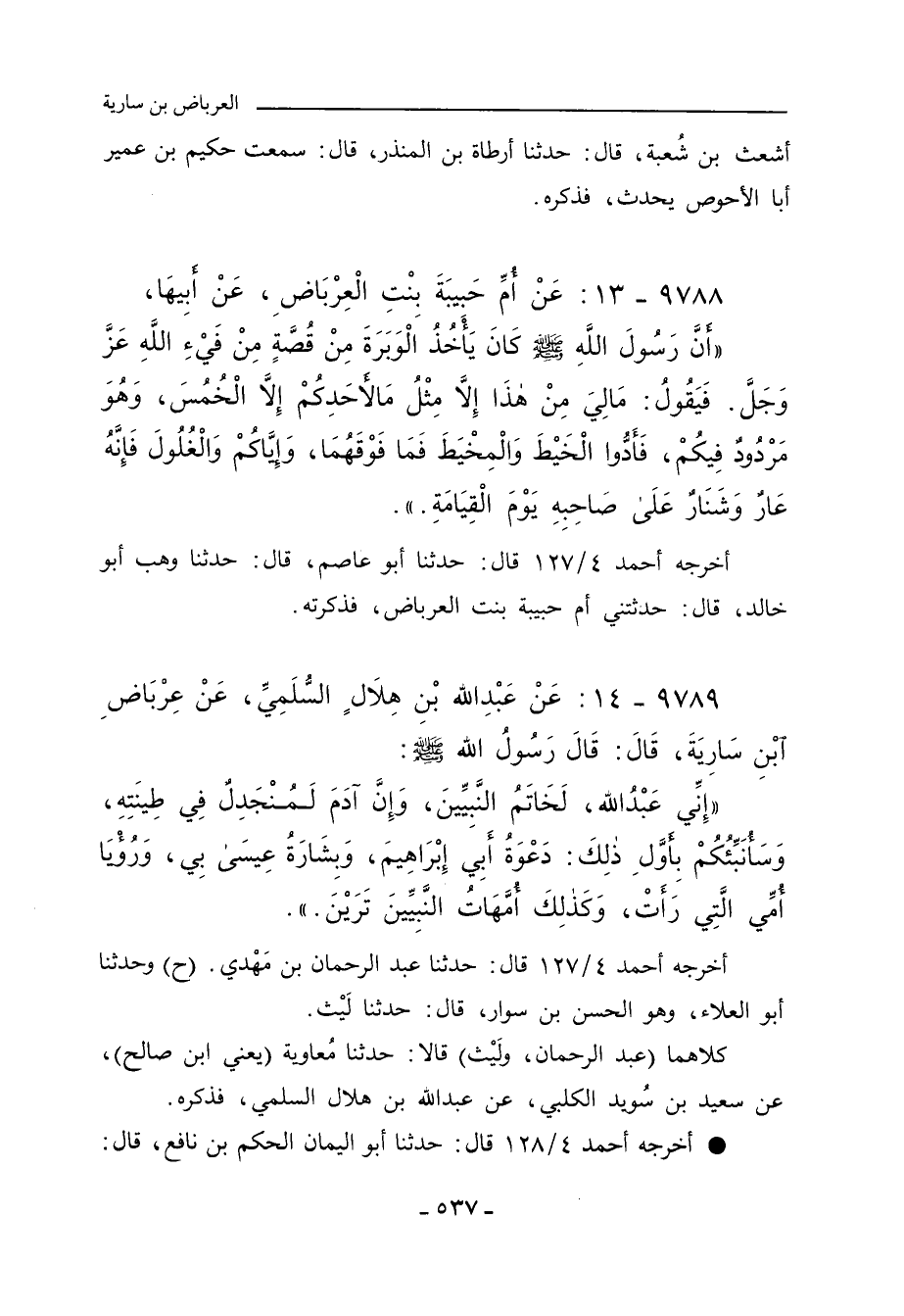 ٩٧٨٨ - عَنْ أُمِّ حَبِيبَةَ ابْنَةِ الْعِرْبَاضِ، قَالَتْ: حَدَّثَنِي أَبِي؛
