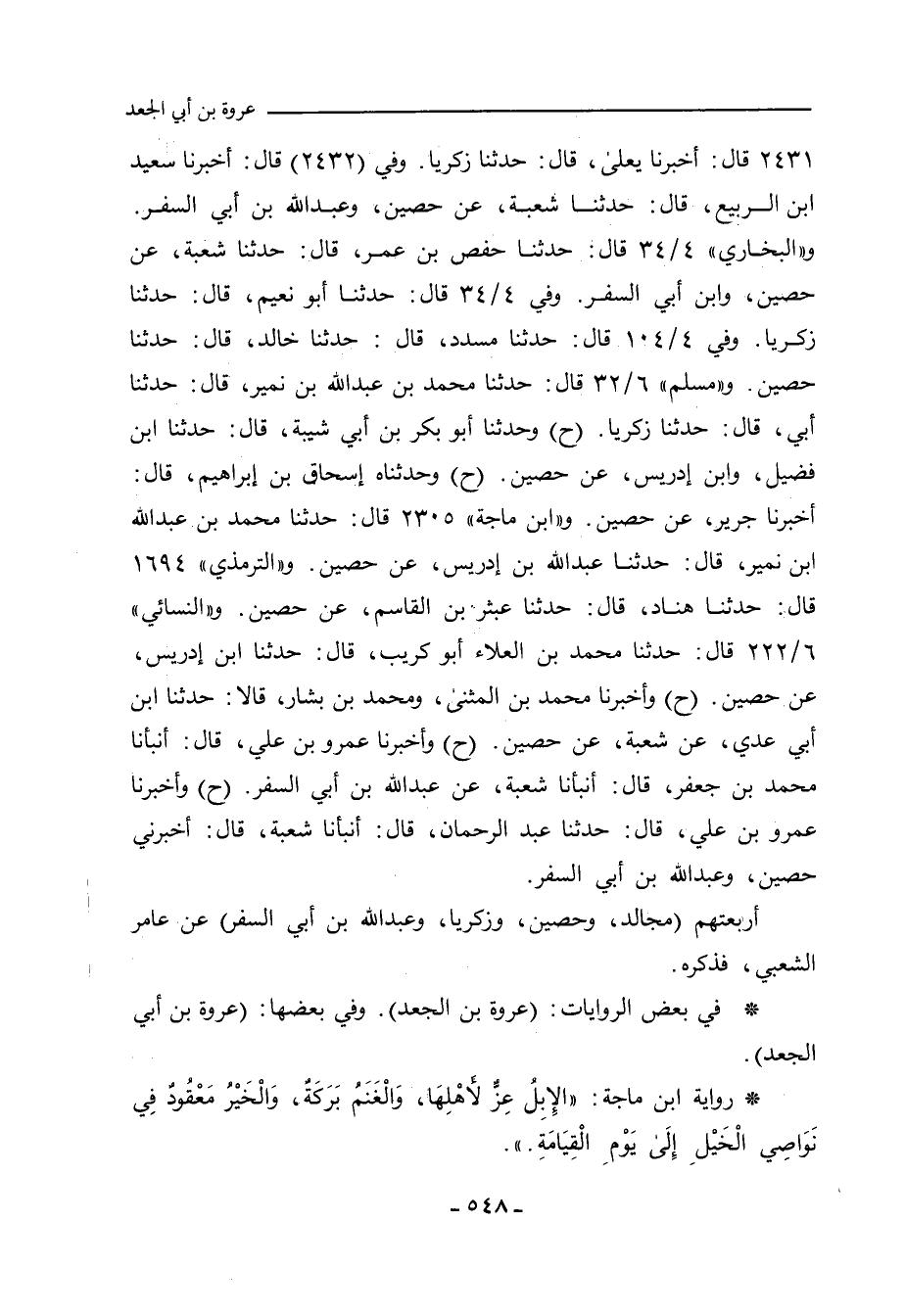 ٢٤٢٦ قال: أَخْبَرنا يَعْلَى، حدَّثنا زكريا. وفي (٢٤٢٧) قال: أَخْبَرنا سَعِيد بن الرَّبِيع، حدَّثنا شُعْبة، عن حُصَيْن، وعَبْد الله بن أَبي السَّفَر. و"البُخَارِي" ٤/ ٣٤ (٢٨٥٠) قال: حدَّثنا حَفْص بن عُمَر، حدَّثنا شُعْبة، عن حُصَيْن، وابن أَبي السَّفَر. وفي (٢٨٥٢) قال: حدَّثنا أبو نُعَيْم، حدَّثنا زكريا. وفي ٤/ ١٠٤ (٣١١٩) قال: حدَّثنا مُسَدَّد، حدَّثنا خالد، حدَّثنا حُصَيْن. و"مسلم"٦/ ٣٢ (٤٨٨٢) قال: حدَّثنا مُحَمد بن عَبْد الله بن نُمَيْر، حدَّثنا أَبي، حدَّثنا زكريا. وفي (٤٨٨٣) قال: وحدَّثنا أبو بَكْر بن أَبي شَيْبَة، حدَّثنا ابن فُضَيْل، وابن إِدْرِيس، عن حُصَيْن. وفي (٤٨٨٤) قال: وحدَّثناه إِسْحاق بن إبراهيم، أَخْبَرنا جَرِير، عن حُصَيْن. و"ابن ماجة"٢٣٠٥ قال: حدَّثنا مُحَمد بن عَبْد الله بن نُمَيْر، حدَّثنا عَبْد الله بن إِدْرِيس، عن حُصَيْن. و"التِّرمِذي"١٦٩٤ قال: حدَّثنا هَنَّاد، حدَّثنا عَبْثَر بن القاسم، عن حُصَيْن. و"النَّسائي" ٦/ ٢٢٢، وفي "الكبرى"٤٤٠٠ قال: حدَّثنا مُحَمد بن العَلَاء، أبو كُرَيْب، قال: حدَّثنا ابن