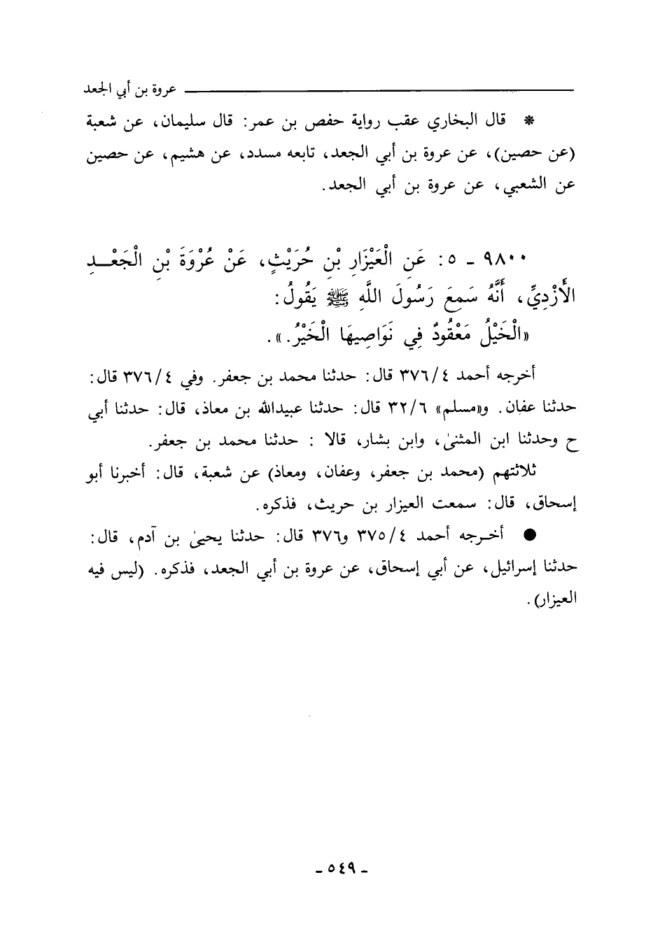 - قال البُخَاري عَقِب رواية حَفْص بن عُمَر: قال سُلَيْمان، عن شُعْبة (عن حُصَيْن): عن عُرْوَة بن أَبي الجَعْد، تَابَعَه مُسَدَّد، عن هُشَيْم، عن حُصَيْن، عن الشَّعْبِي، عن عُرْوَة بن أَبي الجَعْد.