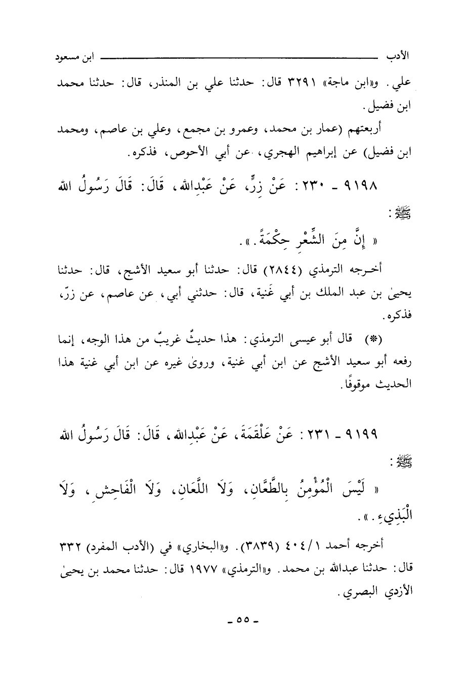 أخرجه أحمد ١/ ٤٠٤ (٣٨٣٩). والبخاري، في) الأدب المفرد (٣٣٢ قال: حدَّثنا عَبْداللهِ بن محمد. و"التِّرمِذي" ١٩٧٧ قال: حدَّثنا محمد بن يحيى الأزدي البصري.