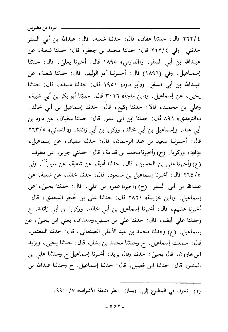 (١٨٤٩٢) قال: حدَّثنا عَفَّان، حدَّثنا شُعْبة، قال: عَبْد الله بن أَبي السَّفَر حدَّثني. وفي ٤/ ٢٦٢ (١٨٤٩٣) قال: حدَّثنا مُحَمد ابن جَعْفَر، قال: حدَّثنا شُعْبة، عن عَبْد الله بن أَبي السَّفَر. و"الدارِمِي" ١٨٨٨ قال: أَخْبَرنا يَعْلَى، حدَّثنا إِسْماعِيل. وفي (١٨٨٩) قال: أَخْبَرنا أبو الوَلِيد، حدَّثنا شُعْبة، عن عَبْد الله بن أَبي السَّفَر. و"أبو داود"١٩٥٠ قال: حدَّثنا مُسَدَّد، حدَّثنا يَحيى، عن إِسْماعِيل. و"ابن ماجة"٣٠١٦ قال: حدَّثنا أبو بَكْر بن أَبي شَيْبَة، وعلي بن مُحَمد، قالا: حدَّثنا وَكِيع، حدَّثنا إِسْماعِيل بن أَبي خالد. و"التِّرمِذي"٨٩١ قال: حدَّثنا ابن أَبي عُمَر، حدَّثنا سُفْيان، عن داود بن أَبي هِنْد، وإِسْماعِيل بن أَبي خالد، وزكريا بن أَبي زائدة. و"النَّسائي" ٥/ ٢٦٣، وفي "الكبرى"٤٠٣٤ قال: أَخْبَرنا سَعِيد بن عَبْد الرَّحْمان، قال: حدثتا سُفْيان، عن إِسْماعِيل، وداود، وزكريا. وفي ٥/ ٢٦٣، وفي "الكبرى"٤٠٣٣ قال: أَخْبَرنا مُحَمد بن قُدَامَة، قال: حدَّثني جَرِير، عن مُطَرِّف. وفي ٥/ ٢٦٣،