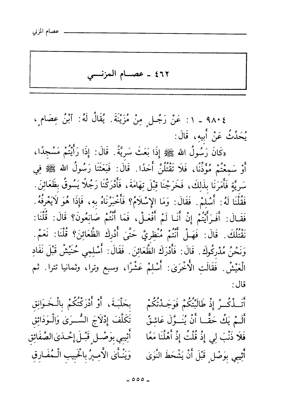 (كَانَ رَسُولُ اللهِ (إِذَا بَعَثَ جَيْشًا أَوْ سَرِيَّةً، قَالَ لَهُمْ: إِذَا رَأَيْتُمْ مَسْجِدًا، أَوْ سَمِعْتُمْ مُؤَذِّنًا، فَلَا تَقْتُلُوا أَحَدًا، فَبَعَثَنَا النَّبِيُّ (فِي سَرِيَّةٍ، فَأَمَرَنَا بِذَلِكَ، فَخَرَجْنَا نَسِيرُ فِي أَرْضِ تِهَامَةَ، فَأَدْرَكْنَا رَجُلاً يَسُوقُ ظَعَائِنَ، فَعَرَضْنَا عَلَيْهِ الإِسْلَامَ، فَقُلْنَا: أَمُسْلِمٌ أَنْتَ؟ فَقَالَ: وَمَا الإِسْلَامُ، فَأَخْبَرْنَاهُ، فَإِذَا هُوَ لَا يَعْرِفُهُ، قَالَ: فَإِنْ لَمْ أَفْعَلْ، فَمَا أَنْتُمْ صَانِعُونَ؟ قُلْنَا: نَقْتُلُكَ، قَالَ: فَهَلْ أَنْتُمْ مُنْظِرِيَّ حَتَّى أُدْرِكَ الظَّعَائِنَ؟ قُلْنَا: نَعَمْ، وَنَحْنُ مُدْرِكُوكَ، فَخَرَجَ فَأَتَى امْرَأَةً، وَهِيَ فِي هَوْدَجِهَا، فَقَالَ: أَسْلِمِي حُبَيْشُ، قَبْلَ انْقِطَاعِ الْعَيْشِ، أَسْلِمِي عَشْرًا، وَثَمَانِيًا تَتْرَى، وَتِسْعًا وِتْرًا، ثُمَّ قَالَ:
