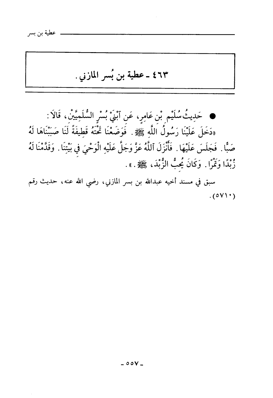 سلف في مسند أخيه عَبْد الله بن بُسْر المازني، رضي الله تعالى عنه، حديث رقم (٦٣٣٤".