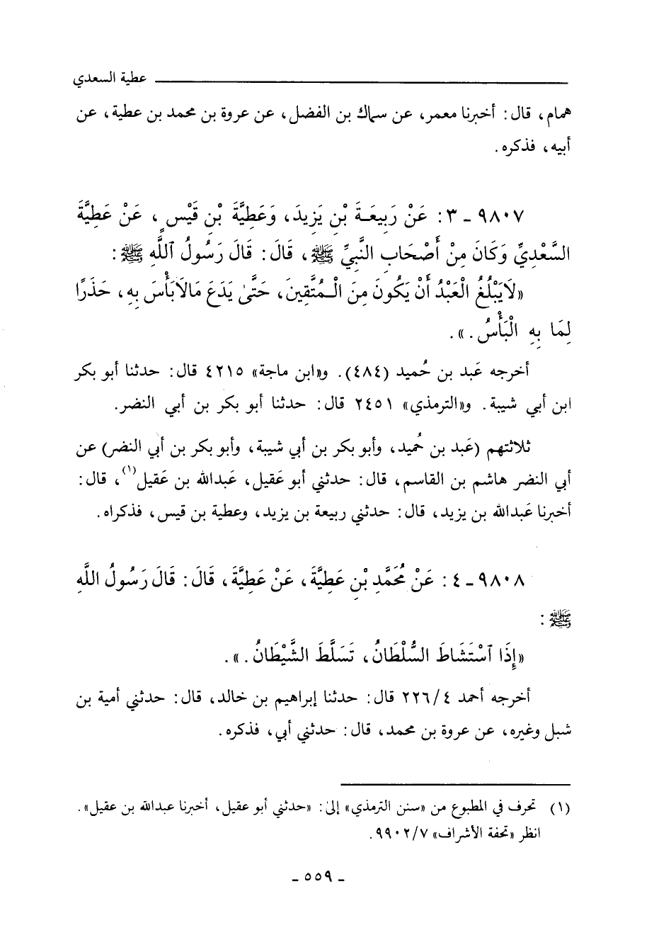 ٩٨٠٧ - عَنْ رَبِيعَةَ بْنِ يَزِيدَ، وَعَطِيَّةَ بْنِ قَيْسٍ، عَنْ عَطِيَّةَ السَّعْدِيِّ، وَكَانَ مِنْ أَصْحَابِ النَّبِيِّ صلى الله عليه وسلم، قَالَ: قَالَ رَسُولُ اللهِ صلى الله عليه وسلم: