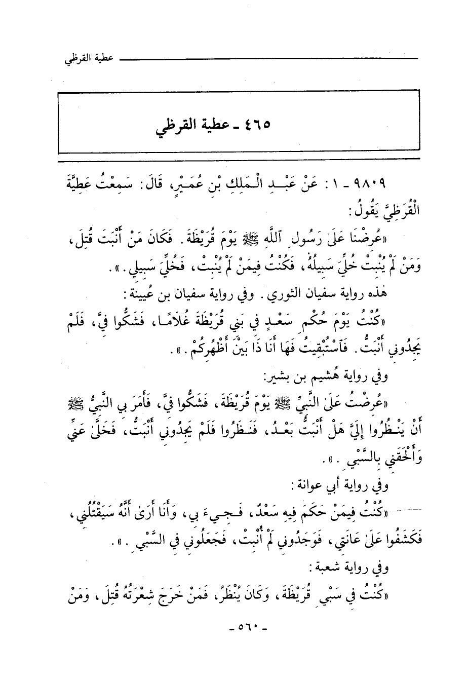 - وفي رواية: كُنْتُ يَوْمَ حُكْمِ سَعْدِ بْنِ مُعَاذٍ فِي بَنِي قُرَيْظَةَ غُلَامًا، فَنَظَرُوا إِلَى مُؤْتَزِرِي، فَلَمْ يَجِدُونِي أَنْبَتُّ، فَهَا أَنَا ذَا بَيْنَ أَظْهُرِكُمْ.