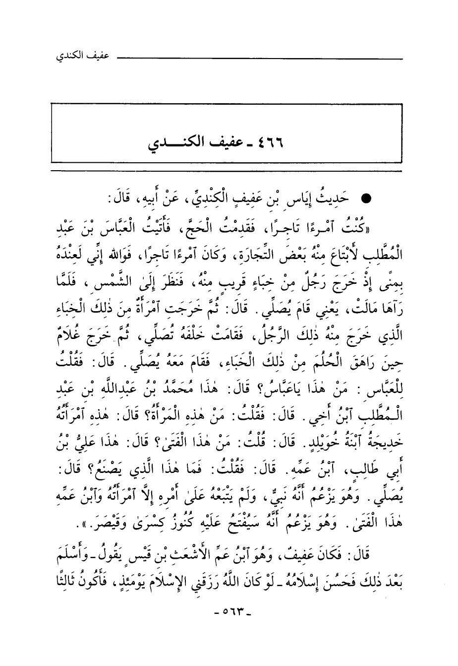 كُنْتُ امْرَءًا تَاجِرًا، فَقَدِمْتُ الْحَجَّ، فَأَتَيْتُ الْعَبَّاسَ بْنَ عَبْدِ الْمُطَّلِبِ، لأَبْتَاعَ مِنْهُ بَعْضَ التِّجَارَةِ، وَكَانَ امْرَءًا تَاجِرًا، فَوَاللهِ، إِنِّي لَعِنْدَهُ بِمِنًى، إِذْ خَرَجَ رَجُلٌ مِنْ خِبَاءٍ قَرِيبٍ مِنْهُ، فَنَظَرَ إِلَى الشَّمْسِ، فَلَمَّا رَآهَا مَالَتْ، يَعْنِي قَامَ يُصَلِّي، قَالَ: ثُمَّ خَرَجَتِ امْرَأَةٌ مِنْ ذَلِكَ الْخِبَاءِ، الَّذِي خَرَجَ مِنْهُ ذَلِكَ الرَّجُلُ، فَقَامَتْ خَلْفَهُ تُصَلِّي، ثُمَّ خَرَجَ غُلَامٌ، حِينَ رَاهَقَ الْحُلُمَ، مِنْ ذَلِكَ الْخِبَاءِ، فَقَامَ مَعَهُ يُصَلِّي، قَالَ: فَقُلْتُ لِلْعَبَّاسِ: مَنْ هَذَا يَا عَبَّاسُ؟ قَالَ: هَذَا مُحَمَّدُ بْنُ عَبْدِ اللهِ ابْنِ عَبْدِ الْمُطَّلِبِ، ابْنُ أَخِي، قَالَ: فَقُلْتُ: مَنْ هَذِهِ الْمَرْأَةُ؟ قَالَ: هَذِهِ امْرَأَتُهُ خَدِيجَةُ ابْنَةُ خُوَيْلِدٍ، قَالَ: قُلْتُ: مَنْ هَذَا الْفَتَى؟ قَالَ: هَذَا عَلِيُّ بْنُ أَبِي طَالِبٍ، ابْنُ عَمِّهِ، قَالَ: فَقُلْتُ: فَمَا هَذَا الَّذِي يَصْنَعُ؟ قَالَ: يُصَلِّي، وَهُوَ يَزْعُمُ أَنَّهُ نَبِيٌّ، وَلَمْ يَتْبَعْهُ عَلَى أَمْرِهِ إِلَاّ امْرَأَتُهُ، وَابْنُ عَمِّهِ، هَذَا الْفَتَى، وَهُوَ يَزْعُمُ أَنَّهُ سَيُفْتَحُ عَلَيْهِ كُنُوزُ كِسْرَى وَقَيْصَرَ.