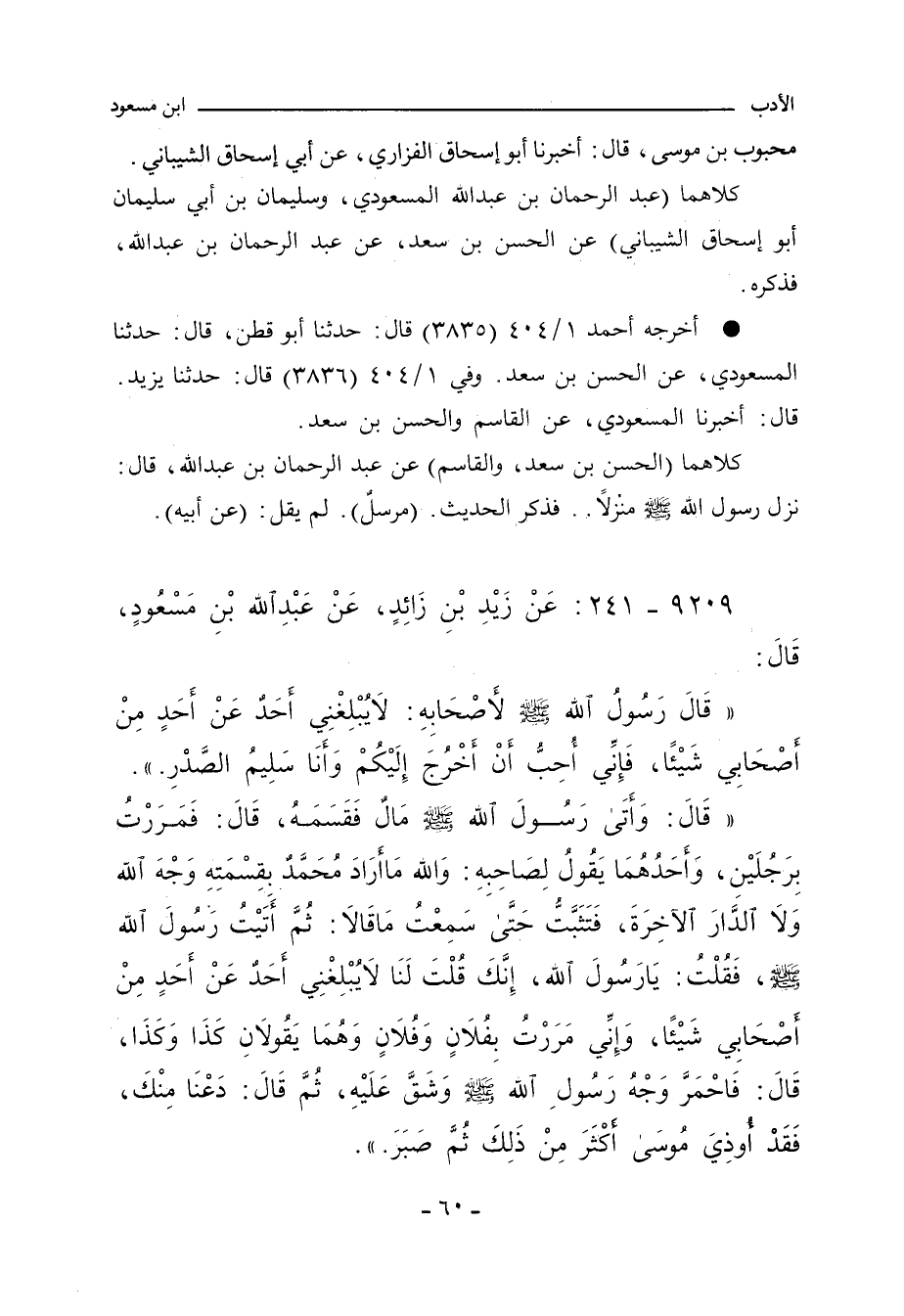 قَالَ: وَأَتَى رَسُولَ اللهِ صلى الله عليه وسلم مَالٌ فَقَسَمَهُ، قَالَ: فَمَرَرْتُ بِرَجُلَيْنِ، وَأَحَدُهُمَا يَقُولُ لِصَاحِبِهِ: وَاللهِ، مَا أَرَادَ مُحَمَّدٌ بقِسْمَتِهِ وَجْهَ اللهِ، وَلَا الدَّارَ الآخِرَةَ، فَتَثَبَّتُّ حَتَّى سَمِعْتُ مَا قَالَا، ثُمَّ أَتَيْتُ رَسُولَ اللهِ صلى الله عليه وسلم، فَقُلْتُ: يَارَسُولَ اللهِ، إِنَّكَ قُلْتَ لَنَا: لَا يُبَلِّغُنِي أَحَدٌ عَنْ أَحَدٍ مِنْ أَصْحَابِي شَيْئًا، وَإِنِّي مَرَرْتُ بِفُلَانٍ وَفُلَانٍ، وَهُمَا يَقُولَانِ كَذَا وَكَذَا، قَالَ: فَاحْمَرَّ وَجْهُ رَسُولِ اللهِ صلى الله عليه وسلم وَشَقَّ عَلَيْهِ، ثُمَّ قَالَ: دَعْنَا مِنْكَ، فَقَدْ أُوذِيَ مُوسَى أَكْثَرَ مِنْ ذَلِكَ، ثُمَّ صَبَرَ.