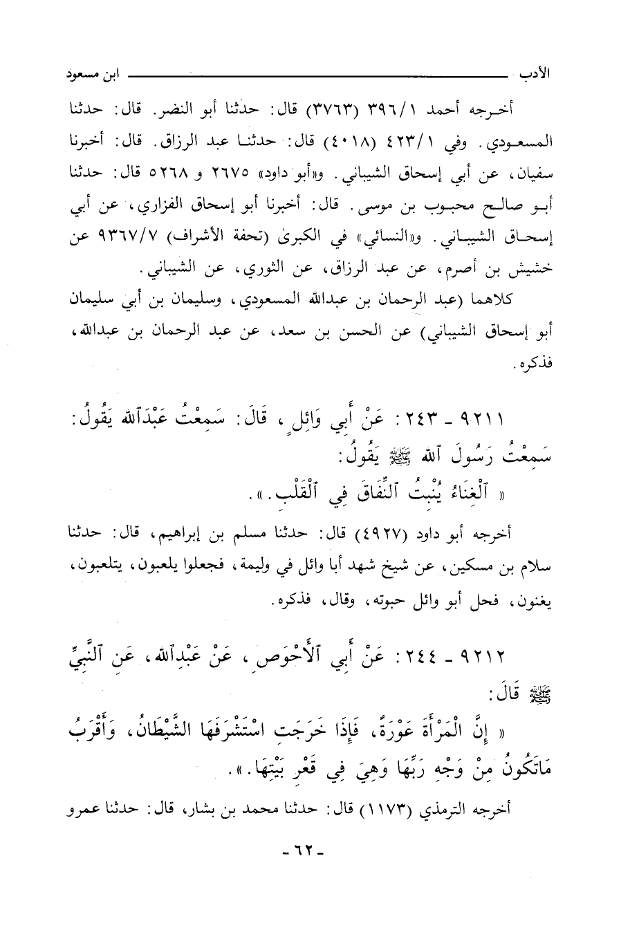 أخرجه أحمد ١/ ٣٩٦ (٣٧٦٣) قال: حدَّثنا أبو النضر، حدَّثنا المسعودي. وفي ١/ ٤٢٣ (٤٠١٨) قال: حدَّثنا عبد الرزاق، أَخْبَرنا سفيان، عن أبي إسحاق الشيباني. و (البخاري)، في) الأدب المفرد (٣٨٢ قال: حدَّثنا طلق بن غنام، قال: حدَّثنا المسعودي. و) أبو داود) ٢٦٧٥ و ٥٢٦٨ قال: حدَّثنا أبو صالح، محبوب بن موسى، أَخْبَرنا أبو إسحاق الفزاري، عن أبي إسحاق الشيباني. و"النَّسائي" في "الكبرى"٨٥٦٠ قال: أَخْبَرنا أبو عاصم، عن عبد الرزاق، عن الثوري، عن الشيباني.