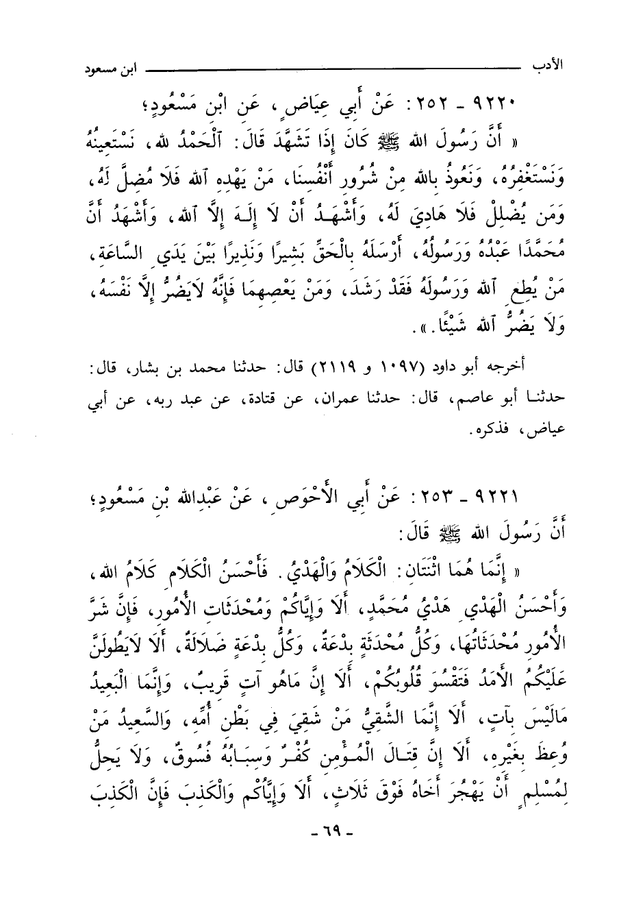 إِنَّمَا هُمَا اثْنَتَانِ: الْكَلَامُ وَالْهَدْيُ، فَأَحْسَنُ الْكَلَامِ كَلَامُ اللهِ، وَأَحْسَنُ الْهَدْيِ هَدْيُ مُحَمَّدٍ، أَلَا وَإِيَّاكُمْ وَمُحْدَثَاتِ الأُمُورِ، فَإِنَّ شَرَّ الأُمُورِ مُحْدَثَاتُهَا، وَكُلُّ مُحْدَثَةٍ بِدْعَةٌ، وَكُلُّ بِدْعَةٍ ضَلَالَةٌ، أَلَا لَا يَطُولَنَّ عَلَيْكُمُ الأَمَدُ، فَتَقْسُوَ قُلُوبُكُمْ، أَلَا إِنَّ مَا هُو آتٍ قَرِيبٌ، وَإِنَّمَا الْبَعِيدُ مَا لَيْسَ بِآتٍ، أَلَا إِنَّمَا الشَّقِيُّ مَنْ شَقِيَ فِي بَطْنِ أُمِّهِ، وَالسَّعِيدُ مَنْ وُعِظَ بِغَيْرهِ، أَلَا إِنَّ قِتَالَ الْمُؤْمِنِ كُفْرٌ، وَسِبَابُهُ فُسُوقٌ، وَلَا يَحِلُّ لِمُسْلِمٍ أَن يَهْجُرَ أَخَاهُ فَوْقَ ثَلَاثٍ، أَلَا وَإِيَّاكُمْ وَالْكَذِبَ، فَإِنَّ الْكَذِبَ