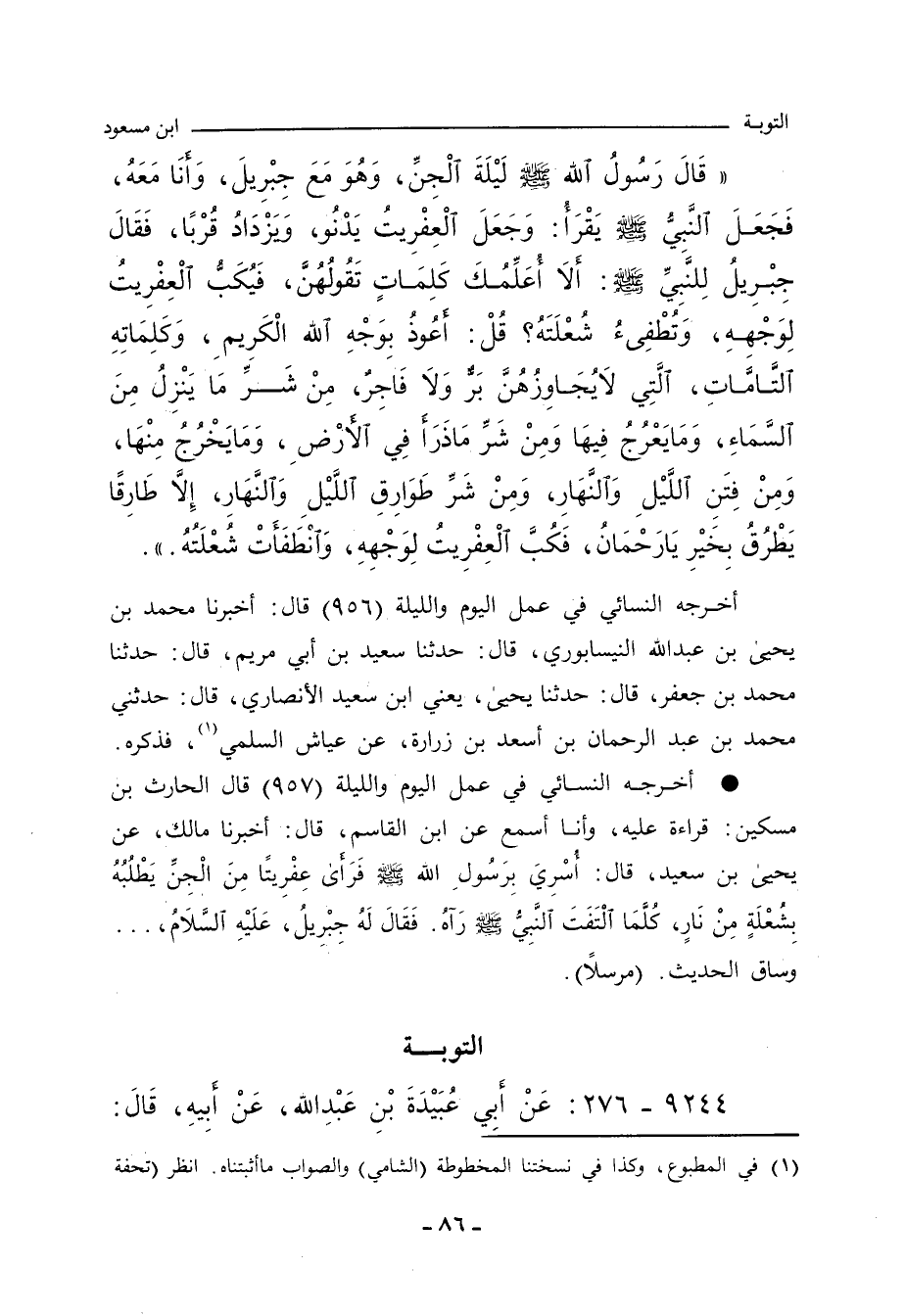 قَالَ رَسُولُ اللهِ صلى الله عليه وسلم لَيْلَةَ الْجِنِّ، وَهُوَ مَعَ جِبْرِيلَ، وَأَنَا مَعَهُ، فَجَعَلَ النَّبِيُّ صلى الله عليه وسلم يَقْرَأُ: وَجَعَلَ الْعِفْرِيتُ يَدْنُو، وَيَزْدَادُ قُرْبًا، فَقَالَ جِبْرِيلُ لِلنَّبِيِّ صلى الله عليه وسلم: أَلَا أُعَلِّمُكَ كَلِمَاتٍ تَقُولُهُنَّ، فَيُكَبُّ الْعِفْرِيتُ لِوَجْهِهِ، وَتُطْفِئُ شُعْلَتَهُ؟ قُلْ: أَعُوذُ بِوَجْهِ اللهِ الْكَرِيمِ، وَكَلِمَاتِهِ التَّامَّاتِ، الَّتِي لَا يُجَاوِزُهُنَّ بَرٌّ وَلَا فَاجِرٌ، مِنْ شَرِّ مَا يَنْزِلُ مِنَ السَّمَاءِ، وَمَايَعْرُجُ فِيهَا، وَمِنْ شَرِّ مَاذَرَأَ فِي الأَرْضِ، وَمَايَخْرُجُ مِنْهَا، وَمِنْ فِتَنِ اللَّيْلِ وَالنَّهَارِ، وَمِنْ شَرِّ طَوَارِقِ اللَّيْلِ وَالنَّهَارِ، إِلَاّ طَارِقًا يَطْرُقُ بِخَيْرِ يَارَحْمَانُ، فَكُبَّ الْعِفْرِيتُ لِوَجْهِهِ، وَانْطَفَأَتْ شُعْلَتُهُ.