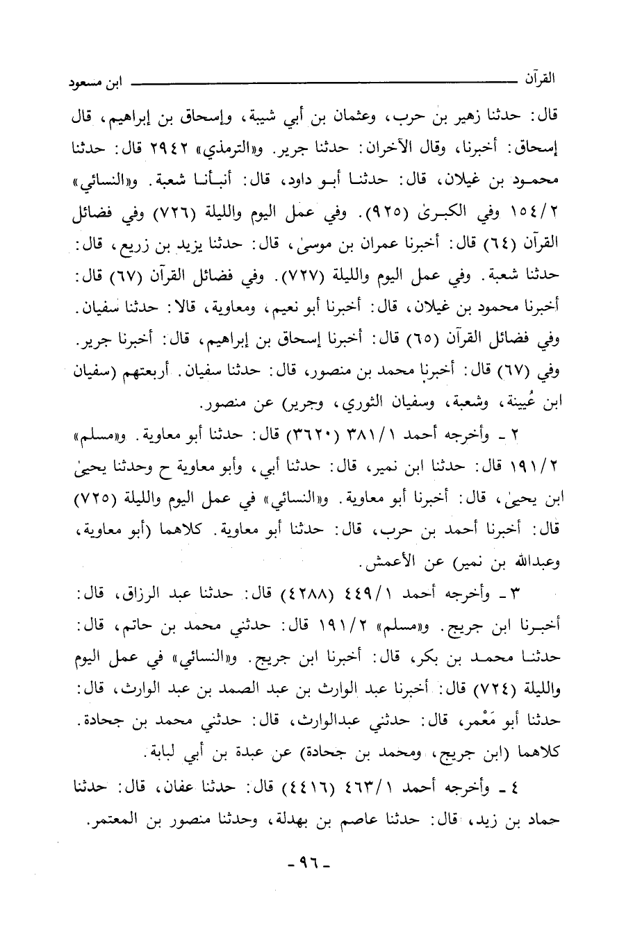 قال: حدَّثنا زُهَير بن حرب، وعثمان بن أبي شيبة، وإسحاق بن إبراهيم، قال إسحاق: أَخْبَرنا، وقال الآخران: حدَّثنا جرير، عن منصور. وفي (١٧٩٢) قال: حدَّثنا ابن نمير، حدَّثنا أبي، وأبو معاوية (ح) وحدَّثنا يحيى بن يحيى، قال: أَخْبَرنا أبو معاوية، عن الأعمش. وفي (١٧٩٣) قال: وحدثني محمد بن حاتم، حدَّثنا محمد بن بكر، أَخْبَرنا ابن جريج، حدثني عبدة بن أبي لبابة. و"التِّرمِذي" ٢٩٤٢ قال: حدَّثنا محمود بن غيلان، حدَّثنا أبو داود، قال: