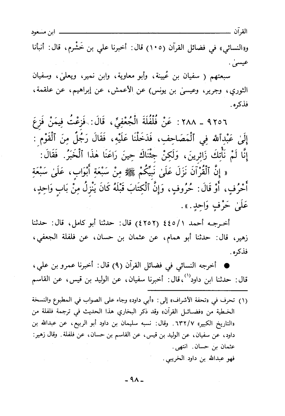 ٩٢٥٦ - عَنْ فُلْفُلَةَ الْجُعْفِيِّ، قَالَ: فَزِعْتُ فِيمَنْ فَزِعَ إِلَى عَبْداللهِ فِي الْمَصَاحِفِ، فَدَخَلْنَا عَلَيْهِ، فَقَالَ رَجُلٌ مِنَ الْقَوْمِ: إِنَّا لَمْ نَأْتِكَ زَائِرِينَ، وَلَكِنْ جِئْنَاكَ حِينَ رَاعَنَا هَذَا الْخَبَرُ. فَقال: