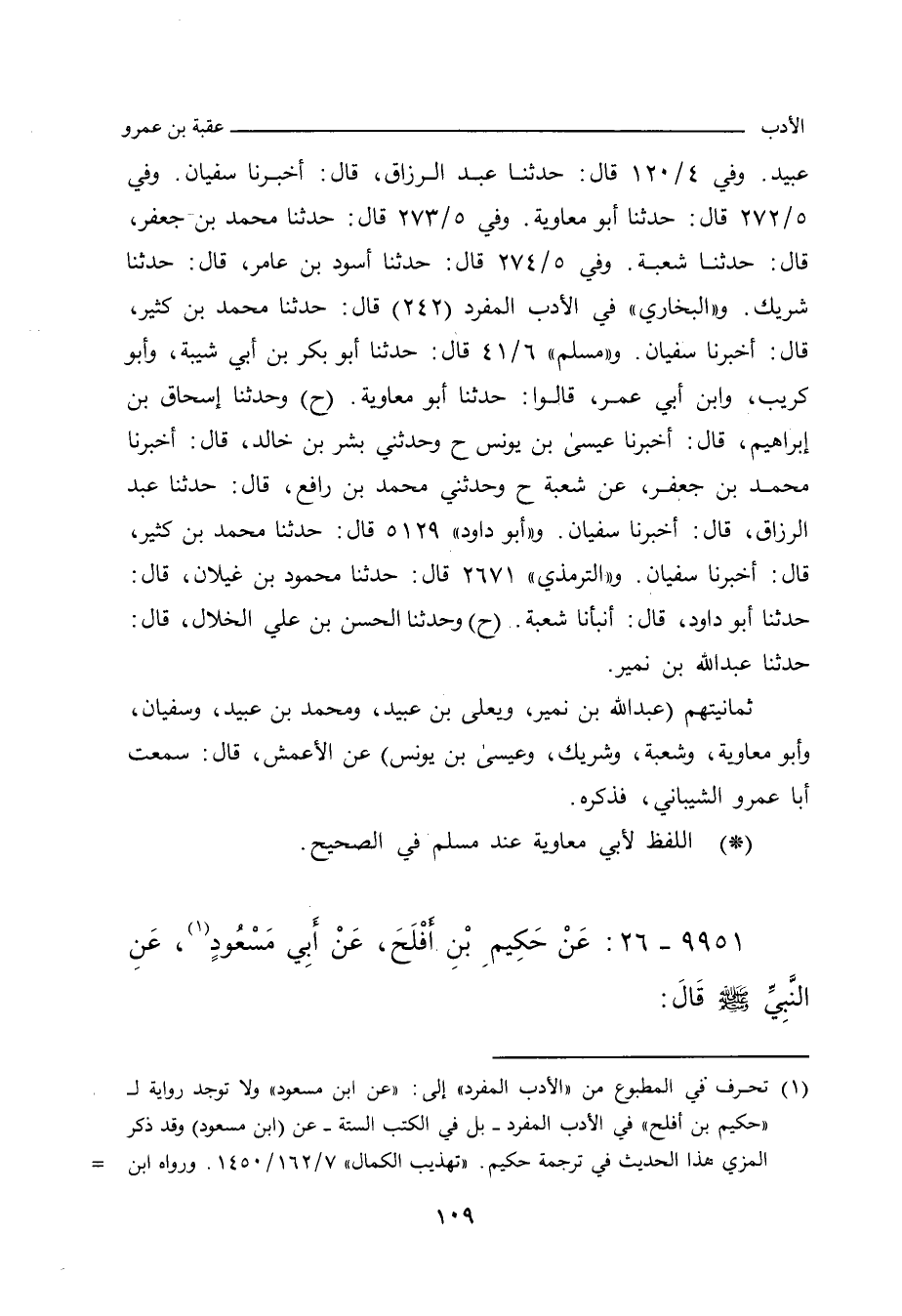 ٩٩٥١ - عَنْ حَكِيمِ بْنِ أَفْلَحَ، عَنْ أَبِي مَسْعُودٍ، عَنِ النَّبِيِّ صلى الله عليه وسلم، قَالَ: