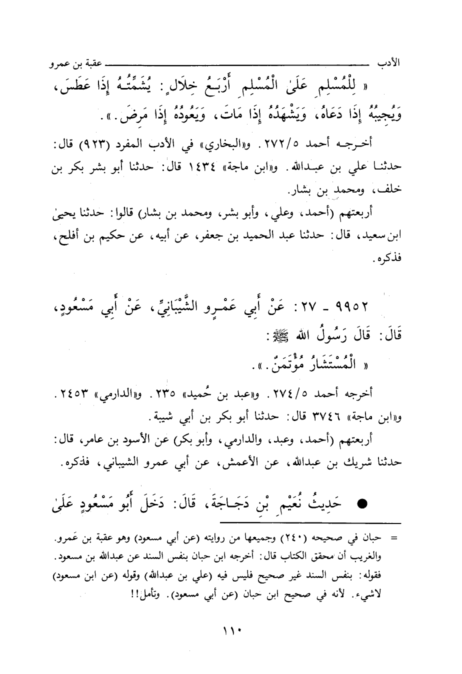 أربعتهم (أحمد، وعبد، والدارمي، وأبو بكر) عن الأَسود بن عامر، حدَّثنا شريك بن عبد الله، عن الأَعمش، عن أبي عمرو الشيباني، فذكره.