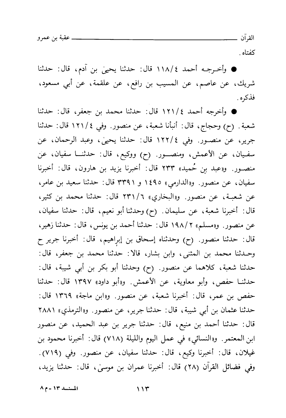 - وأخرجه أحمد ٤/ ١٢١ (١٧٢١٩) قال: حدَّثنا محمد بن جعفر، قال: حدَّثنا شعبة (ح) وحجاج، قال: أنبأنا شعبة، عن منصور. وفي ٤/ ١٢١ (١٧٢٢٤) قال: حدَّثنا جرير، عن منصور. وفي ٤/ ١٢٢ (١٧٢٢٨ و ١٧٢٢٩) قال: حدَّثنا يحيى، وعبد الرحمن، عن سفيان، عن الأَعمش، ومنصور (ح) ووكيع، قال: حدَّثنا سفيان، عن منصور. و (عبد بن حُميد) ٢٣٣ قال: أَخْبَرنا يزيد بن هارون، أَخْبَرنا سفيان، عن منصور. و"الدارِمِي" ١٤٨٧ و ٣٣٨٨ قال: حدَّثنا سعيد بن عامر، عن شعبة، عن منصور. و"البُخَارِي" ٥٠٠٨ قال: حدَّثنا محمد بن كثير، أَخْبَرنا شعبة، عن سليمان. وفي (٥٠٠٩) قال: حدَّثنا أبو نعيم، حدَّثنا سفيان، عن منصور. و"مسلم" ١٨٢٩ قال: حدَّثنا أحمد بن يونس، حدَّثنا زهير، حدَّثنا منصور. وفي (١٨٣٠) قال: وحدَّثناه إسحاق بن إبراهيم، أَخْبَرنا جرير (ح) وحدَّثنا محمد بن المثنى، وابن بشار، قالا: حدَّثنا محمد بن جعفر، حدَّثنا شعبة، كلاهما عن منصور. وفي (١٨٣٤) قال: وحدَّثنا أبو بكر بن أبي شيبة، حدَّثنا حفص، وأبو معاوية، عن الأَعمش. و"أبو داود" ١٣٩٧ قال: حدَّثنا حفص بن عمر، أَخْبَرنا شعبة، عن منصور. و"ابن ماجة" ١٣٦٩ قال: حدَّثنا عثمان بن أبي شيبة، حدَّثنا جرير، عن منصور. و"التِّرمِذي" ٢٨٨١ قال: حدَّثنا أحمد بن منيع، حدَّثنا جرير بن عبد الحميد، عن منصور بن المعتمر. و"النَّسائي" في "عمل اليوم والليلة" ٧١٨ قال: أَخْبَرنا محمود بن غيلان، قال: أَخْبَرنا وكيع، قال: حدَّثنا سفيان، عن منصور. وفي (٧١٩)، وفي "الكبرى" ٧٩٤٩ قال: أَخْبَرنا عمران بن موسى، قال: حدَّثنا يزيد،