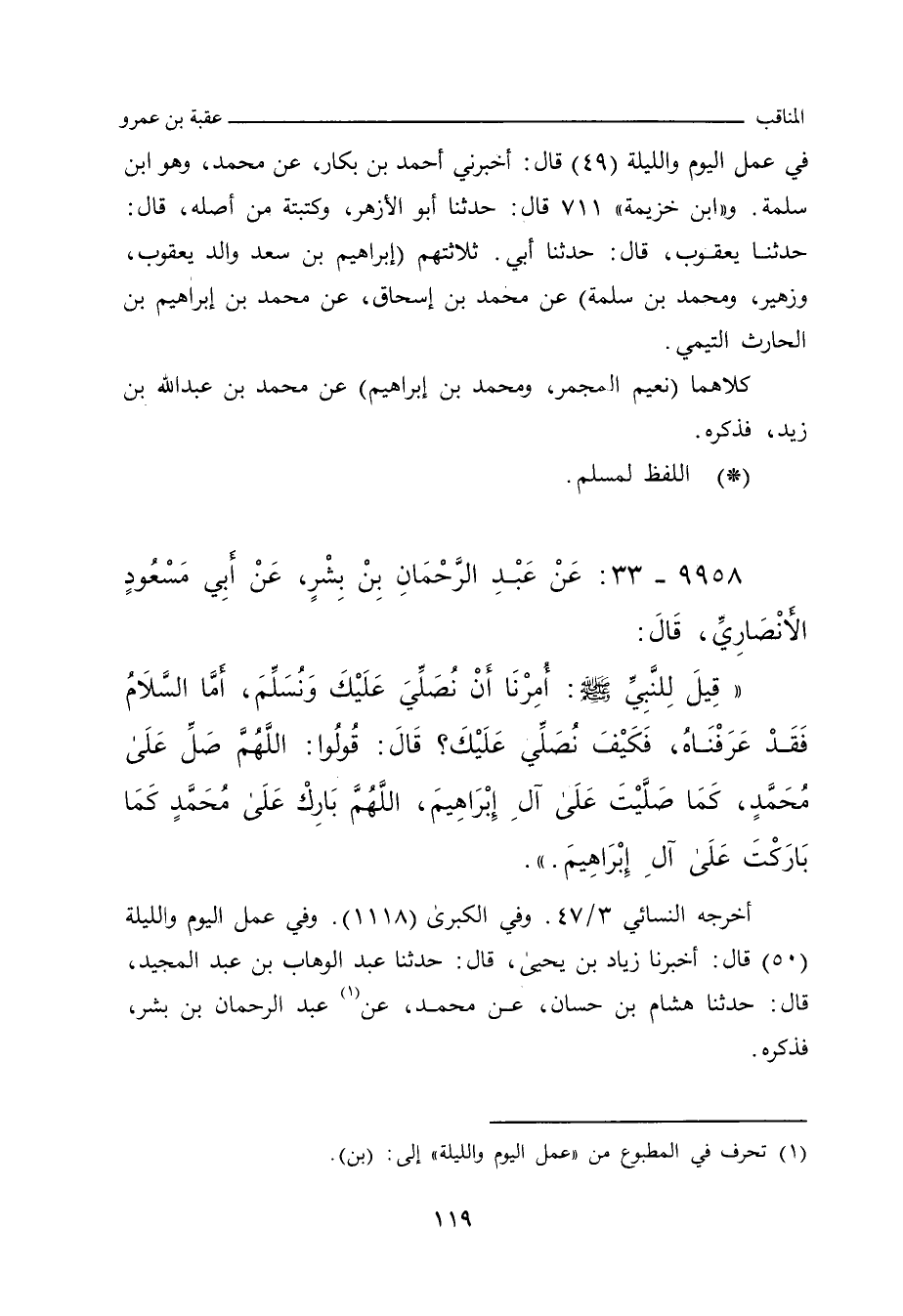 في "عمل اليوم والليلة" ٤٩ قال: أخبرني أحمد بن بكار، عن محمد، وهو ابن سلمة. و"ابن خزيمة" ٧١١ قال: حدَّثنا أبو الأزهر، وكتبتة من أصله، حدَّثنا يعقوب، حدَّثنا أبي. ثلاثتهم (زهير، وإبراهيم بن سعد، والد يعقوب، ومحمد بن سلمة) عن محمد بن إسحاق، عن محمد بن إبراهيم بن الحارث التيمي.