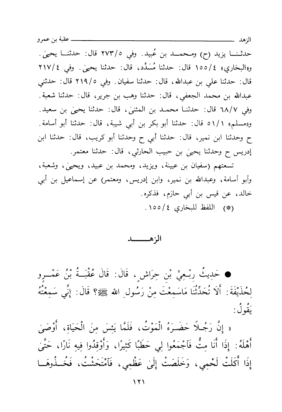 حدَّثنا يزيد (ح) ومحمد بن عُبيد. وفي ٥/ ٢٧٣ (٢٢٦٩٩) قال: حدَّثنا يحيى. و"البُخَارِي" ٣٣٠٢ قال: حدَّثنا مُسَدَّد، حدَّثنا يحيى. وفي (٣٤٩٨) قال: حدَّثنا علي بن عبد الله، حدَّثنا سفيان. وفي (٤٣٨٧) قال: حدثني عبد الله بن محمد الجعفي، حدَّثنا وهب بن جرير، حدَّثنا شعبة. وفي (٥٣٠٣) قال: حدَّثنا محمد بن المثنى، حدَّثنا يحيى بن سعيد. و"مسلم" ٩١ قال: حدَّثنا أبو بكر بن أبي شيبة، حدَّثنا أبو أسامة (ح) وحدَّثنا ابن نمير، حدَّثنا أبي (ح) وحدَّثنا أبو كريب، حدَّثنا ابن إدريس (ح) وحدَّثنا يحيى بن حبيب الحارثي، حدَّثنا معتمر.