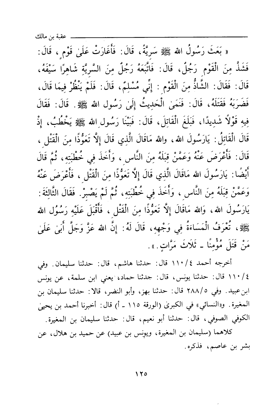 - وفي رواية: عَنْ حُمَيْدِ بن هِلَالٍ، قَالَ أَتَانِي الْوَلِيدُ، أَنَا وَصَاحِبٌ لِي. قَالَ: فَقَالَ لَنَا: هَلُمَّا، فَأَنْتُمَا أَشَبُّ مِنِّي سِنًّا، وَأَوْعَى لِلْحَدِيثِ مِنِّي. قَالَ: فَانْطَلَقَ بِنَا إِلَى بِشْرِ بْنِ عَاصِمٍ. قَالَ: فَقَالَ لَهُ أَبُو الْعَالِيَةِ: تُحَدِّثُ هَذَيْنِ حَدِيثَكَ. قَالَ: حَدَّثَنَا عُقْبَةُ بْنُ مَالِكٍ (قَالَ أَبُو النَّضْرِ: اللَّيْثِىُّ)، (قَالَ بَهْزٌ: وَكَانَ مِنْ رَهْطِهِ)، قَالَ: بَعَثَ رَسُولُ اللهِ صلى الله عليه وسلم سَرِيَّةً، قَالَ: فَأَغَارَتْ عَلَى قَوْمٍ، قَالَ: فَشَذَّ مِنَ الْقَوْمِ رَجُلٌ، قَالَ: فَاتَّبَعَهُ رَجُلٌ مِنَ السَّرِيَّةِ، شَاهِرًا سَيْفَهُ، قَالَ: فَقَالَ: الشًّاذُّ مِنَ الْقَوْمِ: إِنِّي مُسْلِمٌ، قَالَ: فَلَمْ يَنْظُرْ فِيمَا قَالَ، فَضَرَبَهُ فَقَتَلَهُ، قَالَ: فَنَمَى الْحَدِيثُ إِلَى رَسُولِ الله صلى الله عليه وسلم، قَالَ: فَقَالَ فِيهِ قَوْلاً شَدِيدًا، فَبَلَغَ الْقَاتِلَ، قَالَ: فَبَيْنَا رَسُولُ اللهِ صلى الله عليه وسلم يَخْطُبُ، إِذْ قَالَ الْقَاتِلُ: يَا رَسُولَ اللهِ، وَاللهِ، مَا قَالَ الَّذِي قَالَ إِلَاّ تَعَوُّذًا مِنَ الْقَتْلِ، قَالَ: فَأَعْرَضَ عَنْهُ، وَعَمَّنْ قِبَلَهُ مِنَ النَّاسِ، وَأَخَذَ فِي خُطْبَتِهِ، ثُمَّ قَالَ أَيْضًا: يَا رَسُولَ اللهِ، مَا قَالَ الَّذِي قَالَ إِلَاّ تَعَوُّذًا مِنَ الْقَتْلِ، فَأَعْرَضَ عَنْهُ، وَعَمَّنْ قِبَلَهُ مِنَ النَّاسِ، وَأَخَذَ فِي خُطْبَتِهِ، ثُمَّ لَمْ يَصْبِرْ، فَقَالَ الثَّالِثَةَ: يَا رَسُولَ اللهِ، وَاللهِ، مَا قَالَ إِلَاّ تَعَوُّذًا مِنَ الْقَتْلِ، فَأَقْبَلَ عَلَيْهِ رَسُولُ اللهِ صلى الله عليه وسلم , تُعْرَفُ الْمَسَاءَةُ فِي وَجْهِهِ، قَالَ لَهُ: إِنِّ اللهَ، عَزَّ وَجَلَّ،