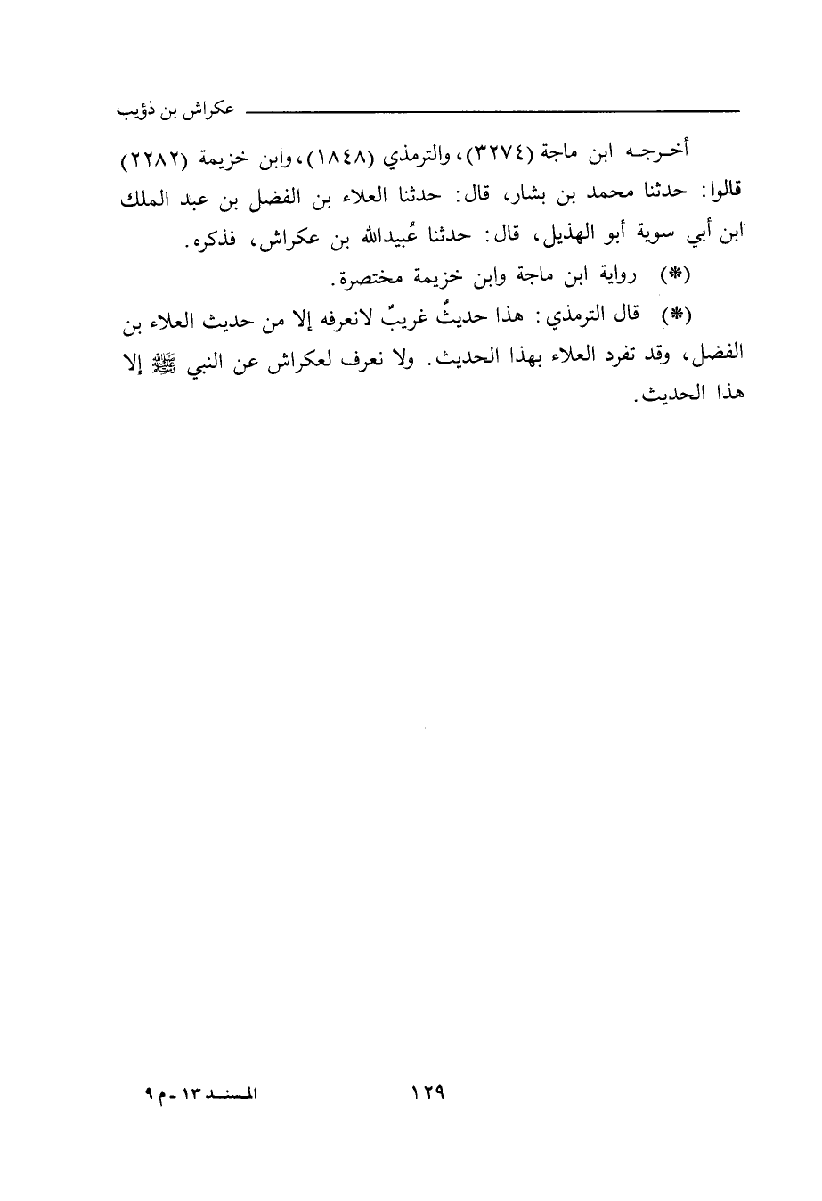 - قال الترمذيُّ: هذا حديثٌ غريبٌ، لَا نعرفُه إِلَاّ من حديث العَلَاء بن الفَضْل، وقد تَفَرَّدَ العَلَاء بهذا الحديث، ولَا نعرف لعِكْرَاش عن النَّبِيِّ صلى الله عليه وسلم إِلَاّ هذا الحديث.