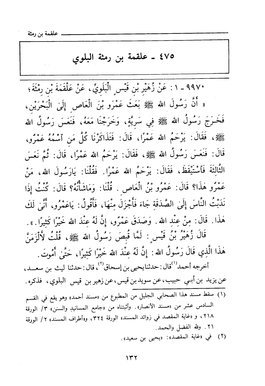 أَنَّ رَسُولَ اللهِ صلى الله عليه وسلم بَعَثَ عَمْرَو بْنَ الْعَاصِ إِلَى الْبَحْرَيْنِ، فَخَرَجَ رَسُولُ اللهِ صلى الله عليه وسلم فِي سَرِيَّةٍ، وَخَرَجْنَا مَعَهُ، فَنَعَسَ رَسُولُ اللهِ صلى الله عليه وسلم، فَقَالَ: يَرْحَمُ اللَّهُ عَمْرًا، قَالَ: فَتَذَاكَرْنَا كُلَّ مَنِ اسْمُهُ عَمْرٌو، قَالَ: فَنَعَسَ رَسُولُ اللهِ صلى الله عليه وسلم، فَقَالَ: يَرْحَمُ اللَّهُ عَمْرًا، قَالَ: ثُمَّ نَعَسَ الثَّالِثَةَ فَاسْتَيْقَظَ، فَقَالَ: يَرْحَمُ اللَّهُ عَمْرًا، فَقُلْنَا: يَا رَسُولَ اللهِ، مَنْ عَمْرٌو هَذَا؟ قَالَ: عَمْرُو بْنُ الْعَاصِ، قُلْنَا: وَمَا شَأْنُهُ؟ قَالَ: كُنْتُ إِذَا نَدَبْتُ النَّاسَ إِلَى الصَّدَقَةِ جَاءَ فَأَجْزَلَ مِنْهَا، فَأَقُولُ: يَا عَمْرُو، أَنَّى لَكَ هَذَا، قَالَ: مِنْ عِنْدِ اللهِ، وَصَدَقَ عَمْرٌو، إِنَّ لَهُ عِنْدَ اللهِ خَيْرًا كَثِيرًا.