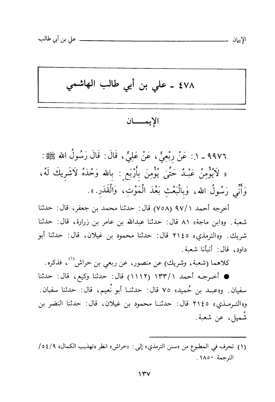 أخرجه أحمد ١/ ٩٧ (٧٥٨) قال: حدَّثنا مُحَمد بن جَعْفَر، حدَّثنا شُعْبة. و"ابن ماجة" ٨١ قال: حدَّثنا عَبْد الله بن عامر بن زُرَارَة، حدَّثنا شَرِيك. و"التِّرمِذي" ٢١٤٥ قال: حدَّثنا محمود بن غَيْلَان، حدَّثنا أبو داود، قال: أنبأنا شُعْبة.