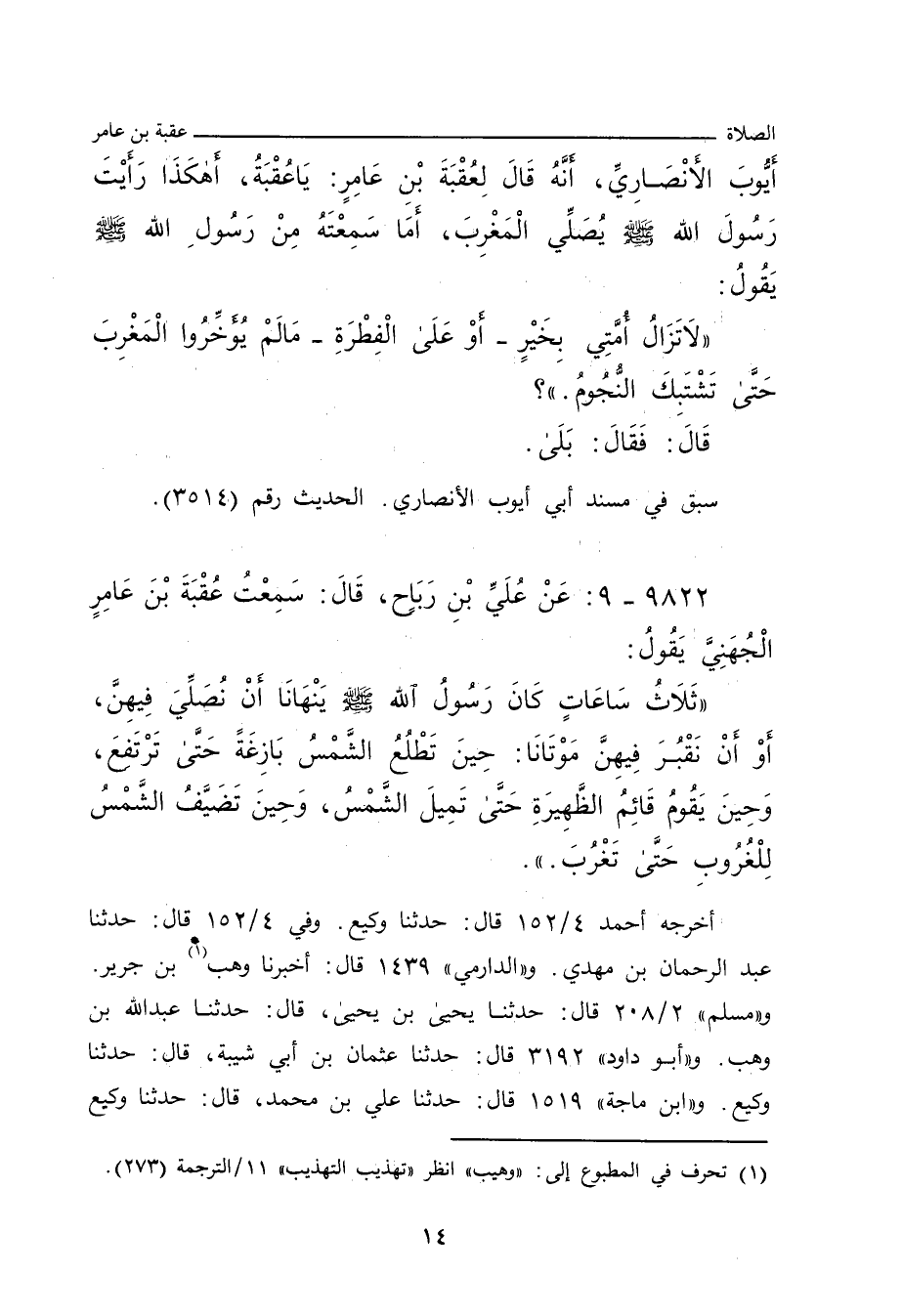 أَيُّوبَ الأَنْصَارِيُّ، فَقَالَ لَهُ: يَا عُقْبَةُ، أَهَكَذَا رَأَيْتَ رَسُولَ اللهِ صلى الله عليه وسلم يُصَلِّي الْمَغْرِبَ؟ أَمَا سَمِعْتَهُ مِنْ رَسُولِ اللهِ صلى الله عليه وسلم يَقُولُ: