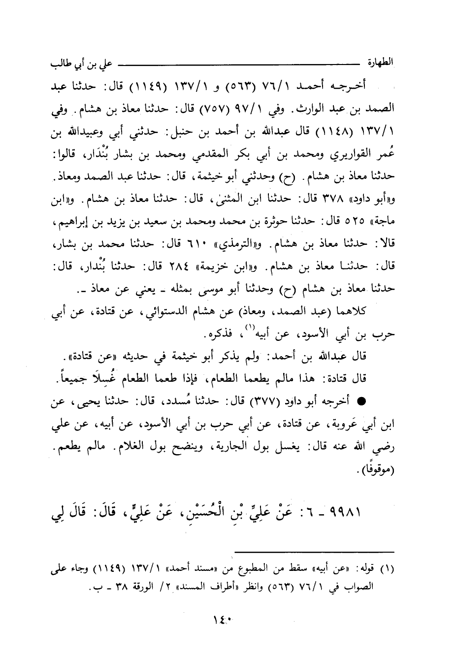 أخرجه أبو داود (٣٧٧) قال: حدَّثنا مُسَدَّد، حدَّثنا يَحيى، عن ابن أَبي عَرُوبَة، عن قَتَادة، عن أَبي حَرْب بن أَبي الأَسْوَد، عن أبيه، عن عليٍّ، رضي الله عنه، قال: يُغسل من بَوْلِ الجارية، ويُنْضَحُ من بَوْلِ الغُلام، مالم يَطْعَمْ. مَوْقُوفٌ.