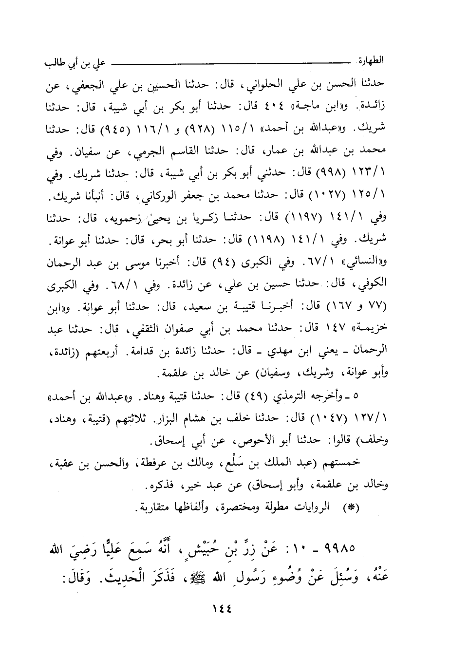 حدَّثنا الحَسَن بن علي الحُلْوَانِي، حدَّثنا الحُسَيْن بن علي الجُعْفِي، عن زائدة، حدَّثنا خالد بن عَلْقَمة الهَمْدَانِي. وفي (١١٣) قال: حدَّثنا مُحَمد بن المُثَنَّى، حدَّثني مُحَمد بن جَعْفَر، حدَّثني شُعْبة، قال: سَمِعْتُ مالك بن عُرْفُطَة. و"ابن ماجة" ٤٠٤ قال: حدَّثنا أبو بَكْر بن أَبي شَيْبَة، حدَّثنا شَرِيك، عن خالد ابن عَلْقَمة. و"التِّرمِذي" ٤٩ قال: حدَّثنا قُتَيْبة، وهَنَّاد، قالا: حدَّثنا أبو الأَحْوَص، عن أَبي إِسْحاق. و (عبد الله بن أحمد) ١/ ١١٣ (٩١٠) و ١/ ١٢٣ (١٠٠٨) قال: حدَّثنا إِسْحاق بن إِسْماعِيل، حدَّثنا مُسْهِر بن عَبْد الملك بن سَلْع، حدَّثنا أَبي عَبْد الملك بن سَلْع. وفي ١/ ١١٤ (٩١٩) و ١/ ١٢٤ (١٠١٦) قال: حدَّثنا إِسْحاق بن إِسْماعِيل، حدَّثنا وَكِيع، حدَّثنا الحَسَن بن عُقْبَة، أبو