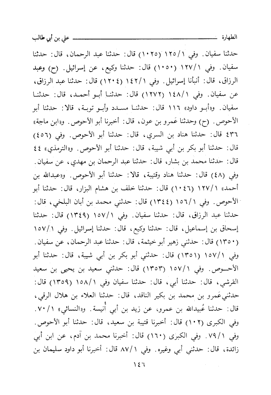 حدَّثنا سُفْيان. وفي ١/ ١٢٥ (١٠٢٥) قال: حدَّثنا عَبْد الرَّحْمان، حدَّثنا سُفْيان. وفي ١/ ١٢٧ (١٠٥٠) قال: حدَّثنا وَكِيع، حدَّثنا إِسْرائِيل (ح) وعَبْد الرَّزَّاق، أنبأنا إِسْرائِيل. وفي ١/ ١٤٢ (١٢٠٥) قال: حدَّثنا عَبْد الرَّزَّاق، عن سُفْيان. وفي ١/ ١٤٨ (١٢٧٣) قال: حدَّثنا أبو أحمد، حدَّثنا سُفْيان. و"أبو داود" ١١٦ قال: حدَّثنا مُسَدَّد، وأبو تَوْبَة، قالا: حدَّثنا أبو الأَحْوَص (ح) وحدَّثنا عَمْرو بن عَوْن، أَخْبَرنا أبو الأَحْوَص. و"ابن ماجة" ٤٣٦ قال: حدَّثنا هَنَّاد بن السَّرِيّ، حدَّثنا أبو الأَحْوَص. وفي (٤٥٦) قال: حدَّثنا أبو بَكْر ابن أَبي شَيْبَة، حدَّثنا أبو الأَحْوَص. و"التِّرمِذي" ٤٤ قال: حدَّثنا مُحَمد بن بَشَّار، حدَّثنا عَبْد الرَّحْمان ابن مَهْدِي، عن سُفْيان. وفي (٤٨) قال: حدَّثنا هَنَّاد، وقُتَيْبة، قالا: حدَّثنا أبو الأَحْوَص. و (عبد الله بن أحمد) ١/ ١٢٧ (١٠٤٦) قال: حدَّثنا خَلَف بن هِشَام البَزَّار، حدَّثنا أبو الأَحْوَص. وفي ١/ ١٥٦ (١٣٤٥) قال: حدَّثني مُحَمد بن أَبَان البَلْخِي، حدَّثنا عَبْد الرَّزَّاق، حدَّثنا سُفْيان. وفي ١/ ١٥٧ (١٣٥٠) قال: حدَّثنا إِسْحاق بن إِسْماعِيل، حدَّثنا وَكِيع، حدَّثنا إِسْرائِيل. وفي (١٣٥١) قال: حدَّثني زُهَيْر أبو خَيْثَمة، حدَّثنا عَبْد الرَّحْمان، عن سُفْيان. وفي (١٣٥٢) قال: حدَّثني أبو بَكْر بن أَبي شَيْبَة، حدَّثنا أبو الأَحْوَص. وفي (١٣٥٤) قال: حدَّثني سَعِيد بن يَحيى بن سَعِيد القُرَشِي، حدَّثنا أَبي، حدَّثنا سُفْيان. وفي ١/ ١٥٨ (١٣٦٠) قال: حدَّثني عَمْرو ابن مُحَمد بن بُكَيْر النَّاقِد، حدَّثنا العَلَاء بن هِلَال الرَّقِّي، حدَّثنا عُبَيْد الله بن عَمْرو، عن زَيْد بن أَبي أُنيسة. و"النَّسائي" ١/ ٧٠، وفي "الكبرى" ١٠٢ قال: