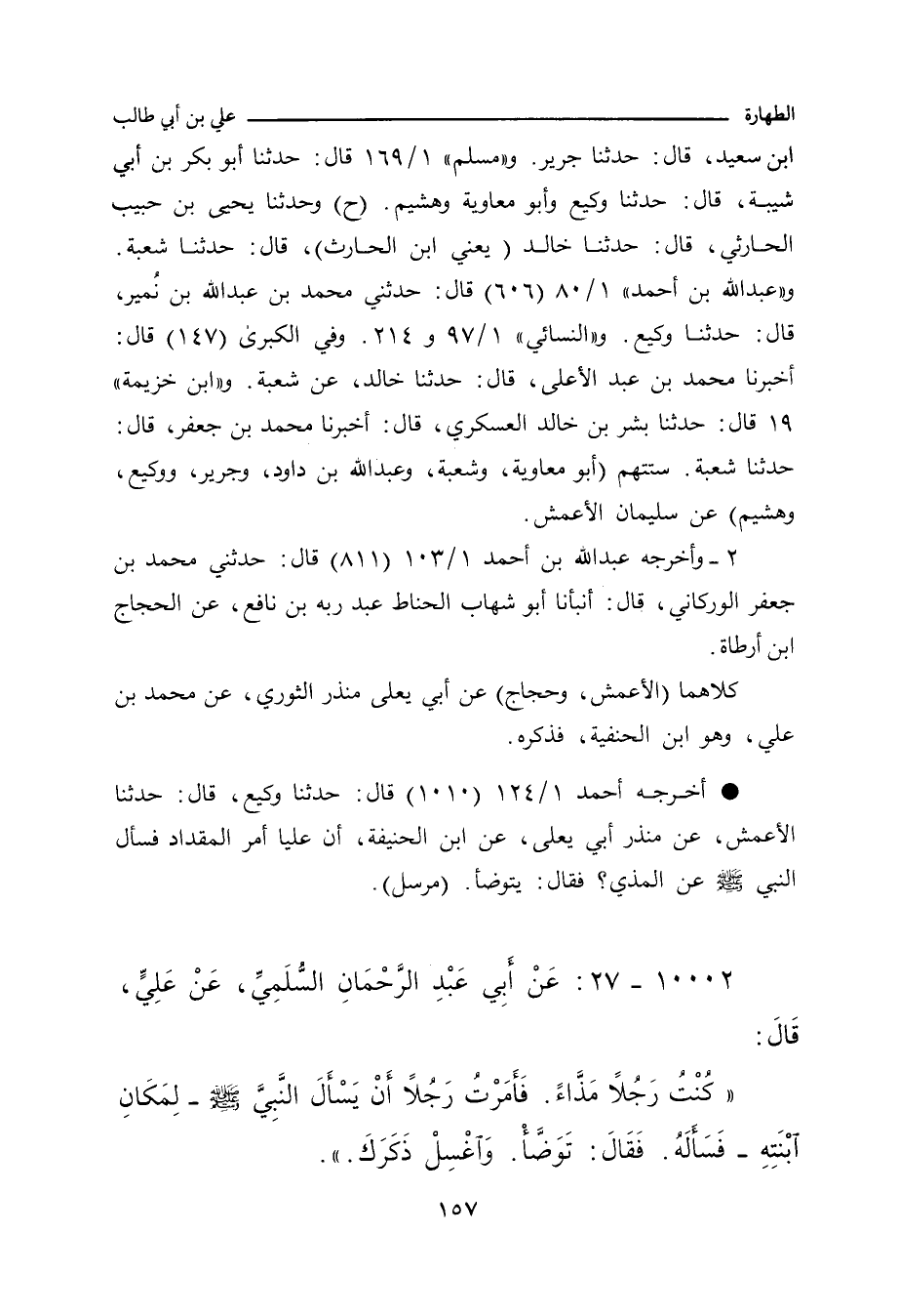 - وفي رواية: كُنْتُ رَجُلاً مَذَّاءً، وَكَانَتْ تَحْتِي ابْنَةُ رَسُولِ اللهِ صلى الله عليه وسلم، فَأَمَرْتُ رَجُلاً فَسَأَلَهُ، فَقَالَ: تَوَضَّأْ وَاغْسِلْهُ.