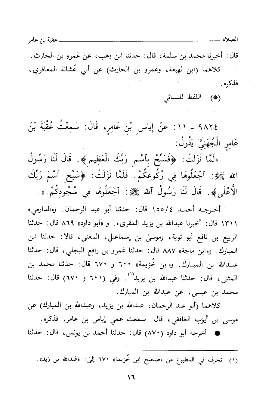 - في رواية ابن المبارك، عند ابن خزيمة: عن موسى بن أيوب، عن عمه، عن عقبة. لم يُسَمِّ عَمَّهُ.