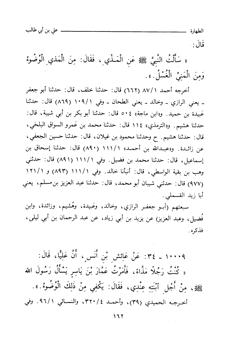 كُنْتُ رَجُلاً مَذَّاءً، فَأَمَرْتُ عَمَّارَ بْنَ يَاسِرٍ يَسْأَلُ رَسُولَ اللهِ صلى الله عليه وسلم، مِنْ أَجْلِ ابْنَتِهِ عِنْدِي، فَقَالَ: يَكْفِي مِنْ ذَلِكَ الْوُضُوءُ.
