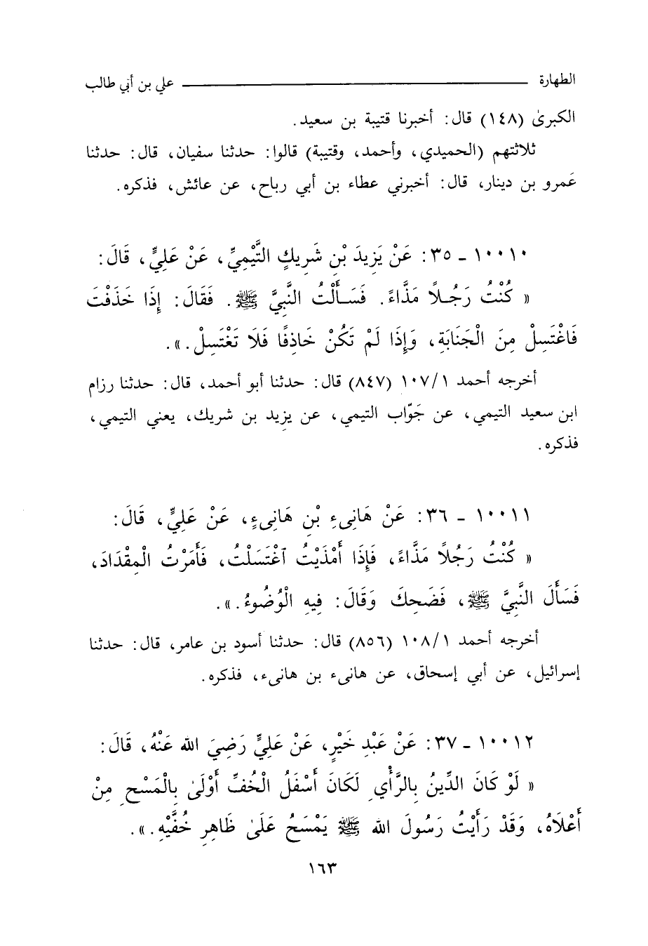 - وفي رواية: رَأَيْتُ عَلِيًّا تَوَضَّأَ، وَمَسَحَ عَلَى النَّعْلَيْنِ، ثُمَّ قَالَ: لَوْلَا أَنِّي رَأَيْتُ رَسُولَ اللهِ صلى الله عليه وسلم فَعَلَ كَمَا رَأَيْتُمُونِي فَعَلْتُ، لَرَأَيْتُ أَنَّ بَاطِنَ الْقَدَمَيْنِ هُوَ أَحَقُّ بِالْمَسْحِ مِنْ ظَاهِرِهِمَا.