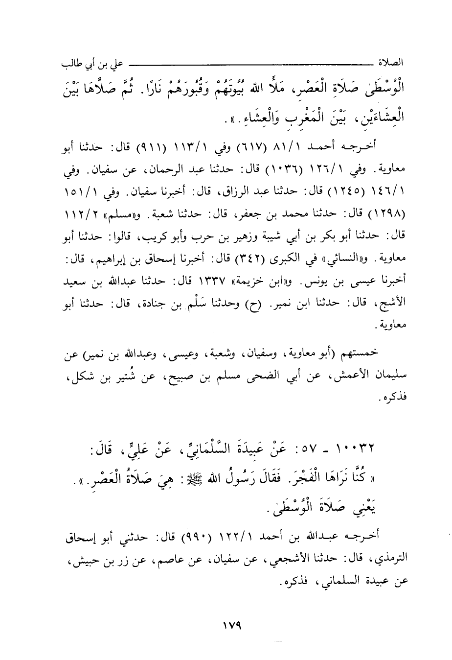 - وفي رواية: عَنْ عَلِيٍّ، قَالَ: شَغَلَنَا الْمُشْرِكُونَ، يَوْمَ الأَحْزَابِ، عَنْ صَلَاةِ الْوُسْطَى، قَالَ رَسُولُ اللهِ صلى الله عليه وسلم: شَغَلُونَا عَنْ صَلَاةِ الْوُسْطَى، صَلَاةِ الْعَصْرِ، مَلأَ اللَّهُ قُبُورَهُمْ، وَبُيُوتَهُمْ، وَأَجْوَافَهُمْ، نَارًا.