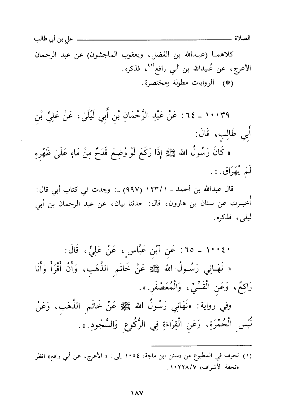 أخرجه أحمد ١/ ١٢٣ (٩٩٧) قال عَبْد الله بن أحمد: وجدتُ في كتاب أَبي، قال: أُخْبِرْتُ عن سِنَان بن هارون، حدَّثنا بَيَان، عن عَبْد الرَّحْمان بن أَبي لَيْلَى، فذكره.