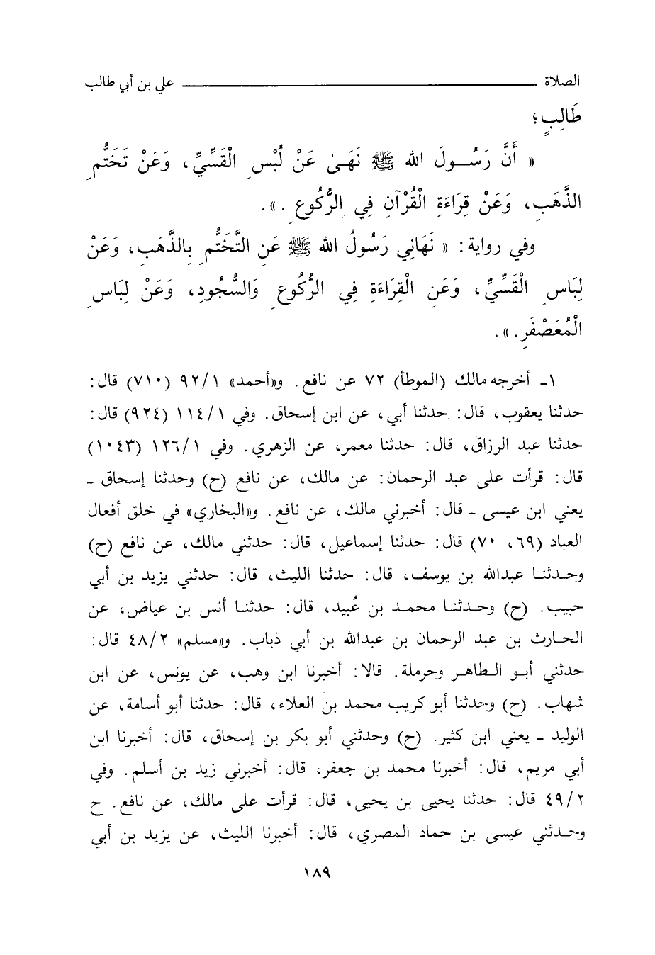 وفي ٢/ ٤٩ (١٠١٣ و ١٠١٤) قال: حدَّثنا يَحيى بن يَحيى، قال: قرأْتُ على مالك: عن نافع (ح) وحدَّثني عِيسَى بن حَمَّاد المِصْرِي، أَخْبَرنا اللَّيْث، عن يَزِيد بن أَبي