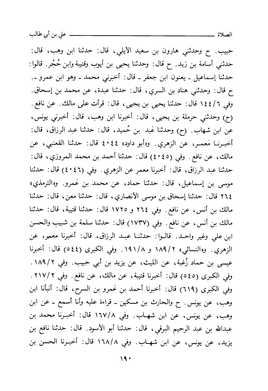 حَبِيب (ح) وحدَّثني هارون ابن سَعِيد الأَيْلِي، حدَّثنا ابن وَهْب، حدَّثني أُسَامة بن زَيْد (ح) قال: وحدَّثنا يَحيى بن أَيُّوب، وقُتَيْبة، وابن حُجْر، قالوا: حدَّثنا إِسْماعِيل، يعنون ابن جَعْفَر، أخبرنىِ مُحَمد، وهو ابن عَمْرو (ح) قال: وحدَّثني هَنَّاد بن السَّرِيّ، حدَّثنا عَبْدَة، عن مُحَمد بن إِسْحاق، كل هؤلاء عن إبراهيم بن عَبْد الله بن حُنَيْن. وفي (١٠١٥) قال: وحدَّثناه قُتَيْبة، عن حاتم بن إِسْماعِيل، عن جَعْفَر بن مُحَمد، عن مُحَمد بن المُنْكَدِر. وفي ٦/ ١٤٤ (٥٤٨٨) قال: حدَّثنا يَحيى بن يَحيى، قال: قرأْتُ على مالك: عن نافع، عن إبراهيم بن عَبْد الله بن حُنَيْن. وفي (٥٤٨٩) قال: وحدَّثني حَرْمَلة بن يَحيى، أَخْبَرنا ابن وَهْب، أخبرني يُونُس، عن ابن شِهَاب، حدَّثني إبراهيم ابن عَبْد الله بن حُنَيْن. وفي (٥٤٩٠) قال: حدَّثنا عَبد بن حُمَيْد، حدَّثنا عَبْد الرَّزَّاق، أَخْبَرنا مَعْمَر، عن الزُّهْرِي، عن إبراهيم بن عَبْد الله بن حُنَيْن. و"أبو داود" ٤٠٤٤ قال: حدَّثنا القَعْنَبِي، عن مالك، عن نافع، عن إبراهيم بن عَبْد الله بن حُنَيْن. وفي (٤٠٤٥) قال: حدَّثنا أحمد بن مُحَمد، يعني المَرْوَزِي، حدَّثنا عَبْد الرَّزَّاق، أَخْبَرنا مَعْمَر، عن الزُّهْرِي، عن إبراهيم بن عَبْد الله ابن حُنَيْن. وفي (٤٠٤٦) قال: حدَّثنا مُوسَى بن إِسْماعِيل، حدَّثنا حَمَّاد، عن مُحَمد بن عَمْرو، عن إبراهيم بن عَبْد الله. و"ابن ماجة" ٣٦٠٢ قال: حدَّثنا أبو بَكْر بن أَبي شَيْبَة، حدَّثنا وَكِيع، عن أُسَامة بن زَيْد. و"التِّرمِذي" ٢٦٤ قال: حدَّثنا إِسْحاق بن مُوسَى الأَنصاري، حدَّثنا مَعْن