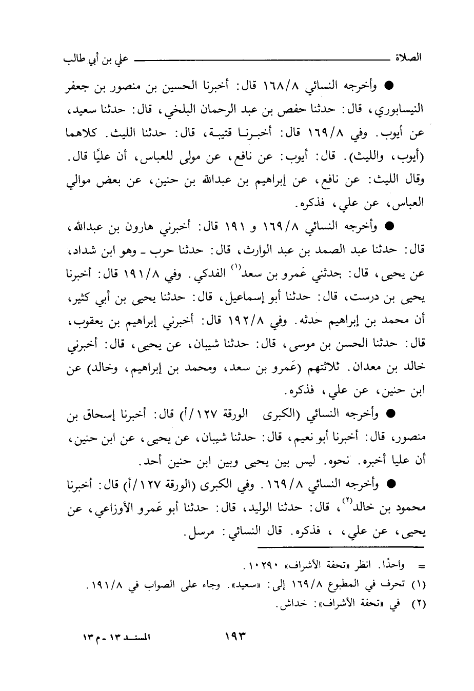 - وأخرجه النَّسَائِي في "الكبرى" ٩٤٢٧ قال: أَخْبَرنا إِسْحاق بن مَنْصُور، قال: أَخْبَرنا أبو نُعَيْم، قال: حدَّثنا شَيْبان، عن يَحيى، عن ابن حُنَيْن، أن عليًّا أخبره. نحوه.